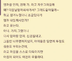 내가 평소에 '롤모델'로 생각하는 엄마인 친구도 비슷한 시기에 비슷한 문제로 비슷한 감정을 겪었다는 사실만으로도 너무 큰 위로가 되었다. 저 친구는 여전히 회사를 잘 다니고 있고, 아이와 관계도 잘 유지하고 있으며 아이도 잘 자라고 있다. 이미 앞서서 잘 헤쳐나간 친구의 모습만으로도 마음이 한결 가벼워졌다.