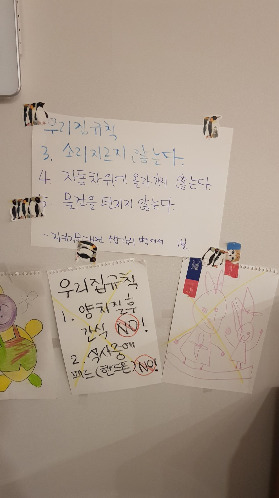 <저녁에 양치질하고 나선 간식 먹지 않기>와 <식사 중에 영상 보지 않기> 두 가지가 기존에 있던 우리 집 규칙이었는데 <소리 지르지 않기> <자동차 위에 올라가지 않기><물건을 던지지 않기> 세 가지를 추가했다. 그리고 소리를 지르거나 물건을 던지는 행동을 하면, 벽을 보고 1분 동안 서서 생각을 하기로 약속했다.