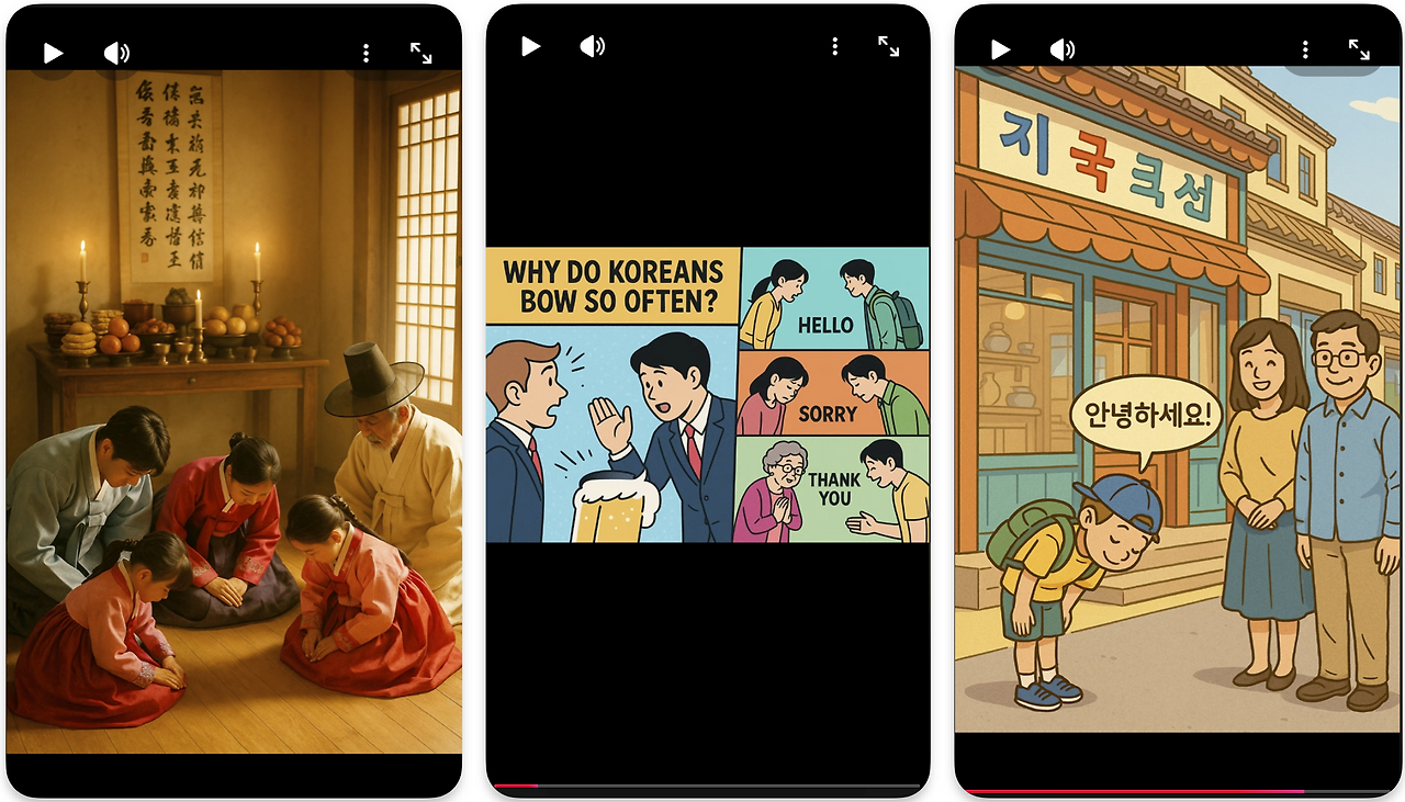 앞서 본 한국 문화 쇼츠를 생각해 보세요. 그 영상을 본 외국인은 한국인이 제사와 같은 특별한 의식에 갓을 쓰고 다니며, 평소 인사할 때 합장을 한다고 믿을 수 있습니다. 그리고 그 믿음은 다시 댓글과 공유를 통해 확산될 수 있습니다. 잘못된 이해가 '상식'이 되는 순간입니다.