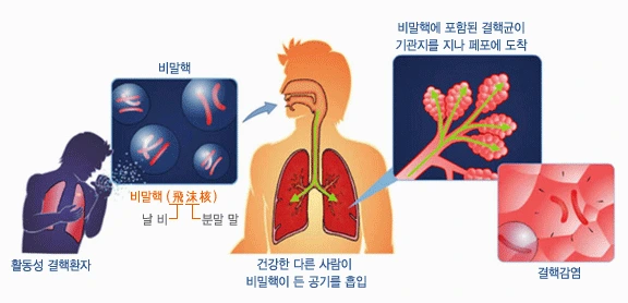 결핵균이 몸속에 들어온 뒤 인체의 저항력이 약해지면 결핵이 생기게 된다고 한다. 코로나 19처럼 비말에 의해 전달되는 감염병이고 결핵의 감염 과정은 다음과 같다고 한다.
