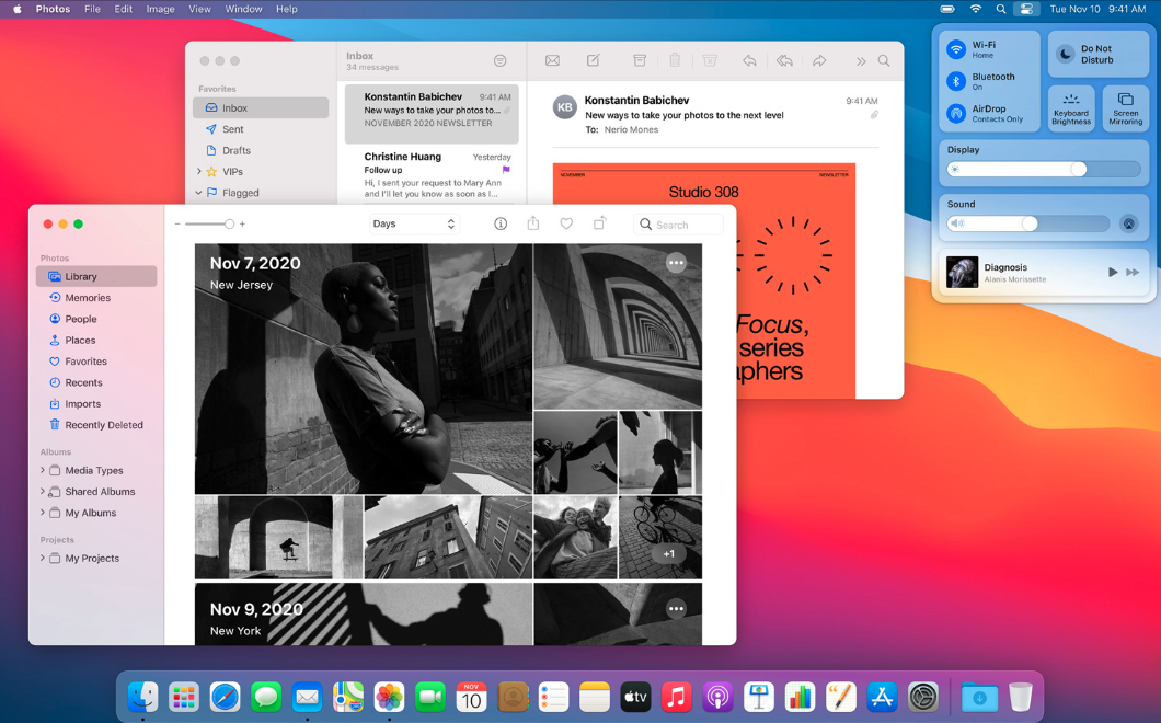 Big Sur는 이제 아이폰이나 아이패드와 같은 디자인으로 변경이 되었다. 그동안은 mac OS은 형제들과 조금은 다른 디자인을 가져갔었는데 이제 한 가족이 된 것 같은 그런 느낌이 든다. 아이폰과 같은 제어센터도 생겼고, 알림 센터 같은 것은 잘 사용하지 않지만 아이폰처럼 위젯을 사용할 수 있기도 하다.