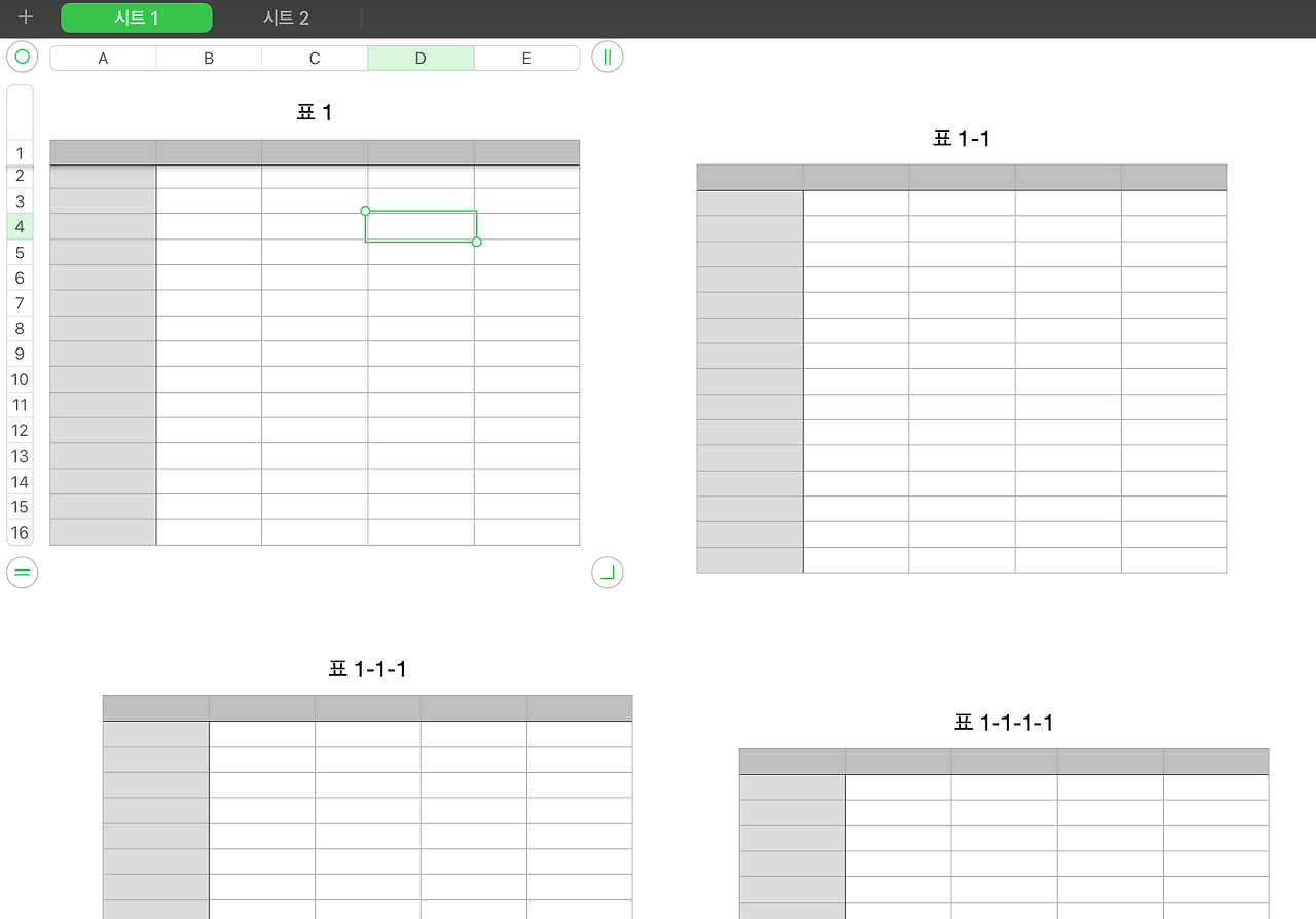 애플의 Numbers는 사실 다른 스프레드시트와 좀 다른 점이 있다. 일반적으로 시트 안에 1개의 스프레드시트를 이용할 수 있지만 Number는 하나의 시트에 여러 개의 표라는 이름으로 스프레드시트를 이용할 수 있다.