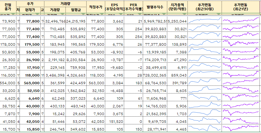 위 그림과 같은 기능을 프로그램으로 만들려면 웹 크롤링(Crawling)을 통해 데이터를 수집하는 프로그램을 개발하고 화면 UI도 만들어야 하는 복잡합이 있지만 코딩 없이 함수 몇 개만 사용하면 쉽게 구현을 할 수 있다. 그리고 GOOLEFINANCE라는 함수를 이용하면 구글에서 제공하는 주가 정보를 불러와 이용할 수 있도 있다.