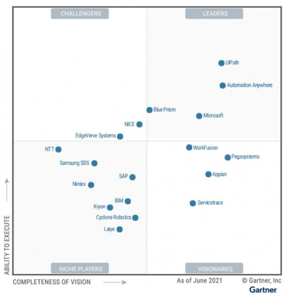 Gartner에서 제공되는 2021 매직 쿼더런트 RPA 리더들을 아래 그림에서 만나볼 수 있습니다. 눈에 익은 회사들이 있으신가요? 한번쯤 들어 봤만한 회사 IBM, SAP 등은 리더그룹에 있지 못하며 최근에 마이크로소프트가 리더 그룹에 합류가 되었습니다. 잘 보시면 아시겠지만 국내 기업(Samsung SDS)도 포함되어 있지만 아직 NICHE Players 군에 있는 것을 확인할 수 있습니다. 그래도 그 군에서 상위에 속하네요.