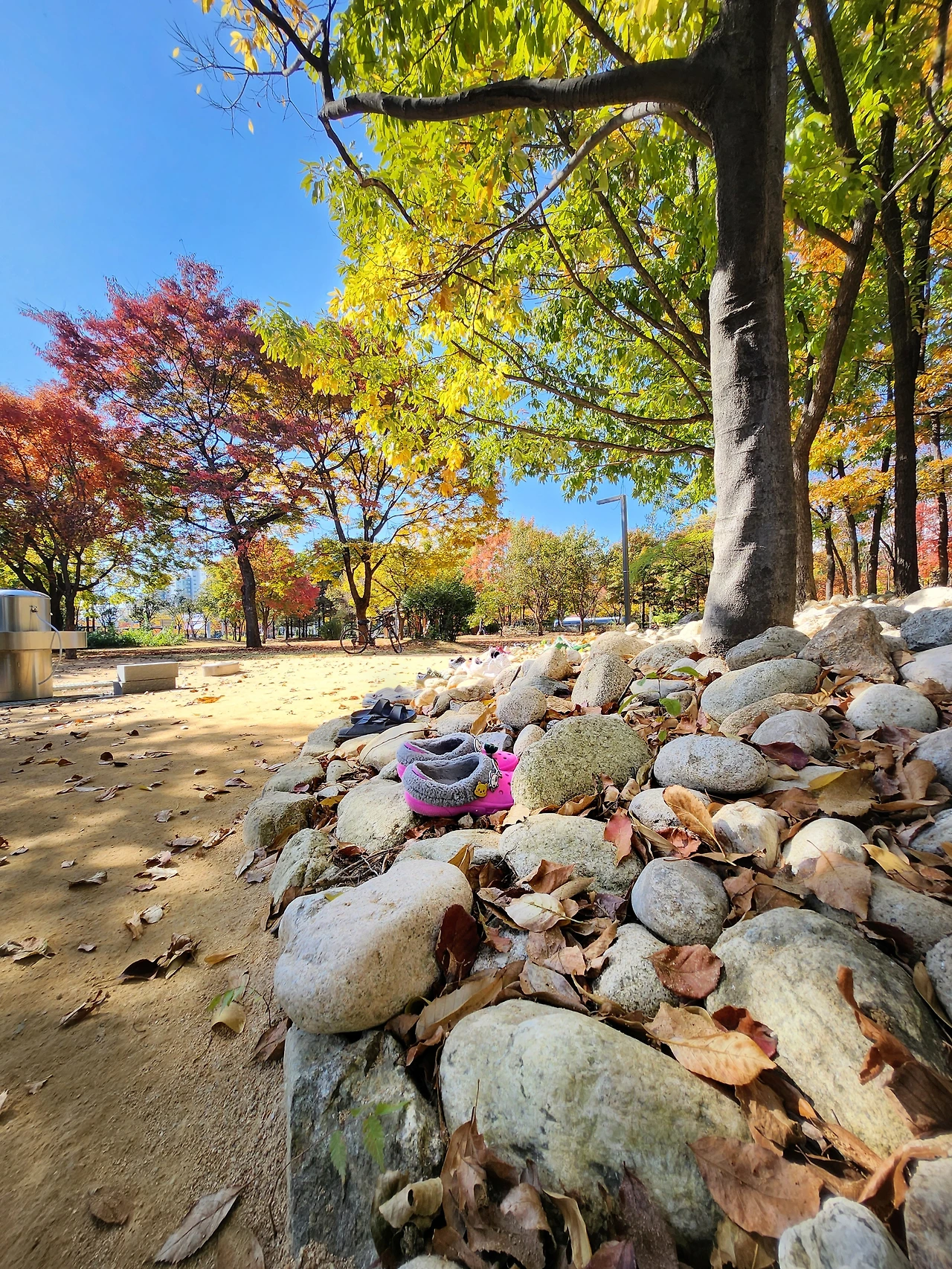 산책로를 따라 돌면서 가을을 담다 보니 맨발로 산책을 하고 계신 어르신들이 많이 보입니다. 아, 맨발로 걸을 수 있는 산책로로 새 단장을 한 것이구나. 걷다 보니 운동화를 벗고 걸어야 하는 건가?라는 생각이 잠시 들었지만 그냥 걸어 봅니다.