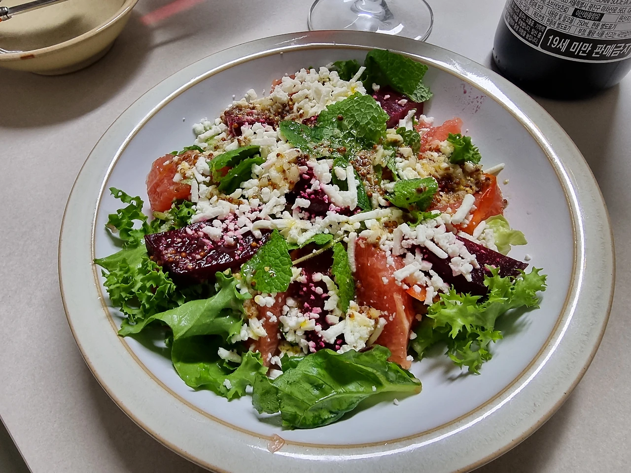 재료: 자몽, 비트, 짜투리 채소, 페타치즈, 민트, 드레싱 (겨자 드레싱*)