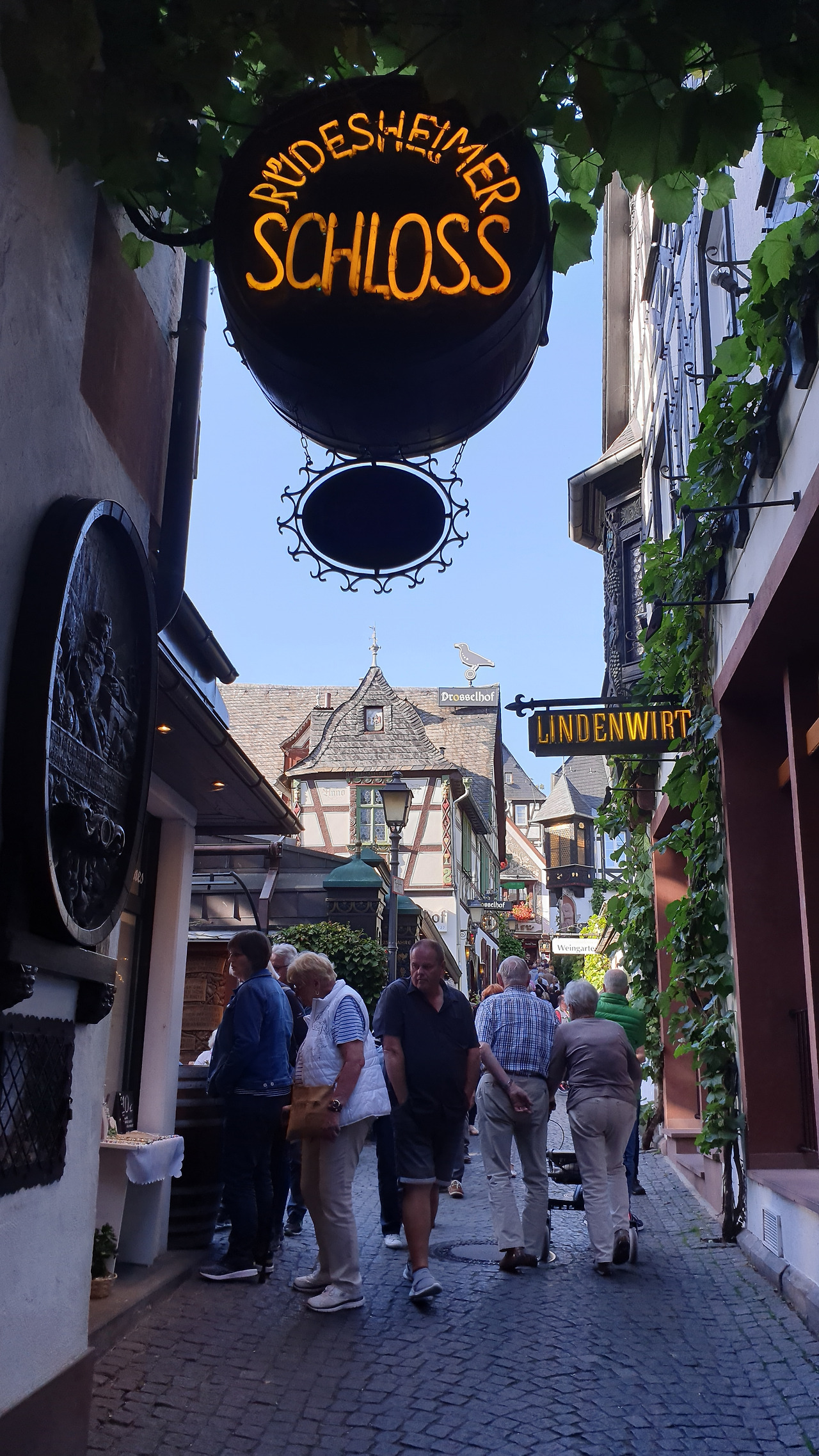 아쉽지만 이렇게 라인가우 와이너리 투어를 마무리하고, 생일 케이크를 사러 근처에 있는 뤼데스하임에 들렀다. 이곳은 중상류 라인 계곡으로 향하는 유람선이 출발하는 곳이라 항상 왁자지껄하다. 유람선 선착장 앞에는 유리컵에 무심하게 담긴 1유로짜리 와인들을 들고 유람선을 기다리는 사람들로 북적였다. 북적이는 인파를 끼고 오른쪽으로 나있는 작은 길로 몸을 틀면 또 다른 세상이 펼쳐진다. 포도 넝쿨이 벽을 가득 채우고, 그 사이로 아기자기한 예쁜 간판들이 주렁주렁 달려있는 아름다운 골목길이 시작된다. 차도 지나갈 수 없는 좁은 골목 양편으로 와인숍과 레스토랑들이 빼곡히 들어서 있다. 고풍스러운 분위기에 네온사인까지도 아름답게 녹아들어 너무너무 아름다웠다. 남편의 생일 케이크를 사려고 구석구석 열심히 돌아다녔지만 적당한 케이크를 찾지 못했다. 대신 추워져서 나오지 않을 줄 알았던 납작 복숭아를 살 수 있었다.