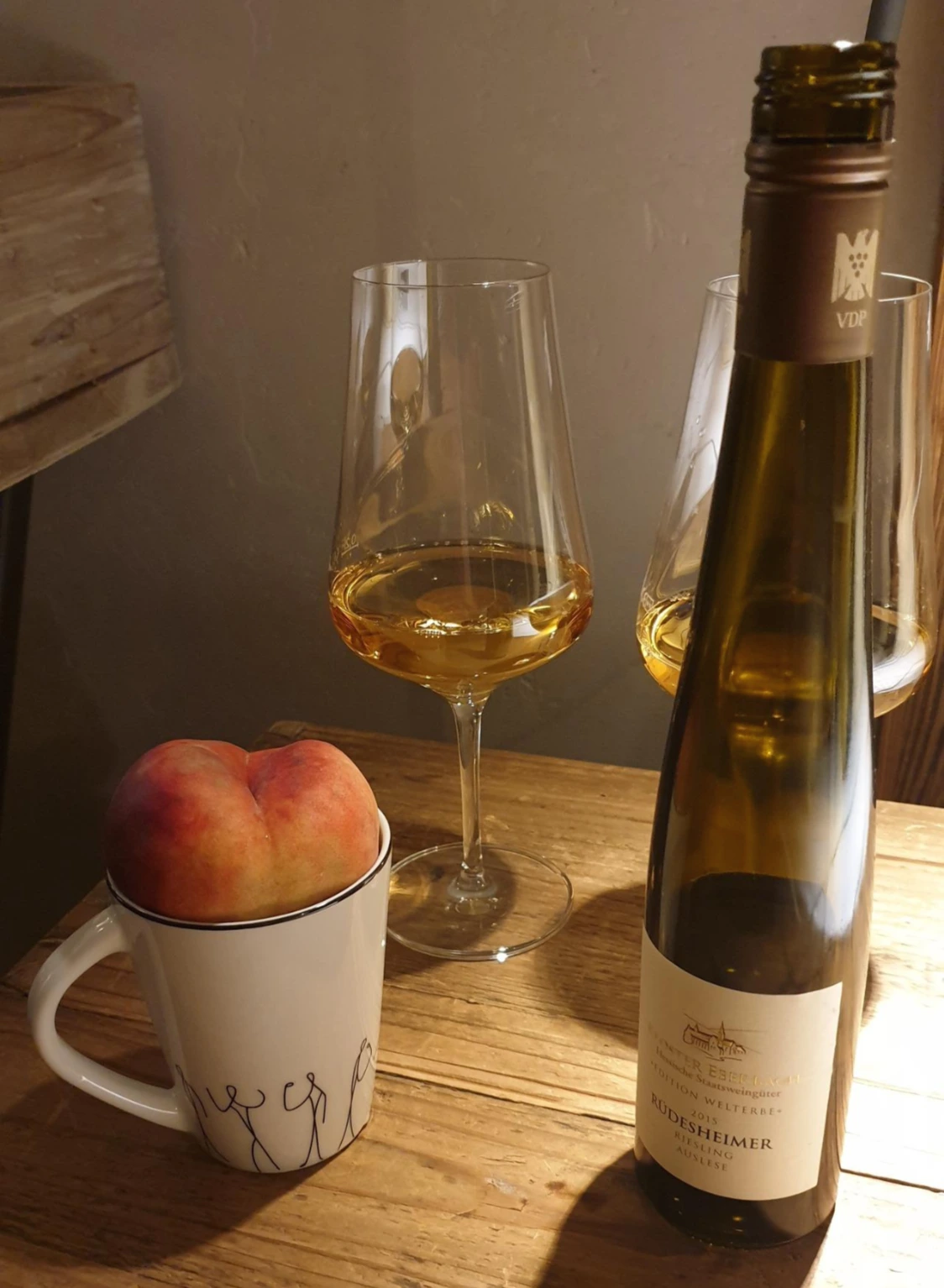 납작 복숭아만 몇 개 사들고 터벅터벅 숙소로 돌아왔다. 운전하느라 하루 종일 와인 냄새만 맡던 남편도 드디어 함께 마실 수 있게 되었다. 방에 돌아오자마자 낮에 사두었던 에버바흐 수도원의 아우스레제를 꺼냈다. 아우스레제는 슈페트레제보다 더 늦은 시기에 수확한 포도로 만들어 더 달고 더 깊은 벌꿀향이 난다. 병을 열자마자 아카시아 꿀 향기가 은은하게 방으로 퍼져나갔다. 침대에 나란히 누워 달달한 와인과 납작 복숭아를 먹으니 정말 행복했다.