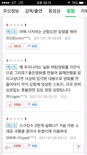 개봉 전부터 많은 사람들의 이목이 집중되었었던 <군함도>. 일단 출연진부터 어마어마하다. 황정민, 소지섭, 송중기, 이정현까지. 그리고 다수의 유명한 조연들까지. 무엇보다도 실제 우리나라에 있었던 가슴 아픈 역사를 바탕으로 제작했다는 사실이 그 관심의 이유였을 것이다. 사실 언론과 인터넷에서 엄청나게 기대를 모으고 있는 <군함도>를 보며 기대 반 걱정 반이었다. 이렇게 많은 사람들의 기대를 받는 영화가 혹시라도 재미가 없거나 지루해서 오히려 욕만 엄청 먹으면 어떡하지. 그리고 개봉 날 당일 아침에 <군함도> 평점을 찾아봤더니 세상에나.