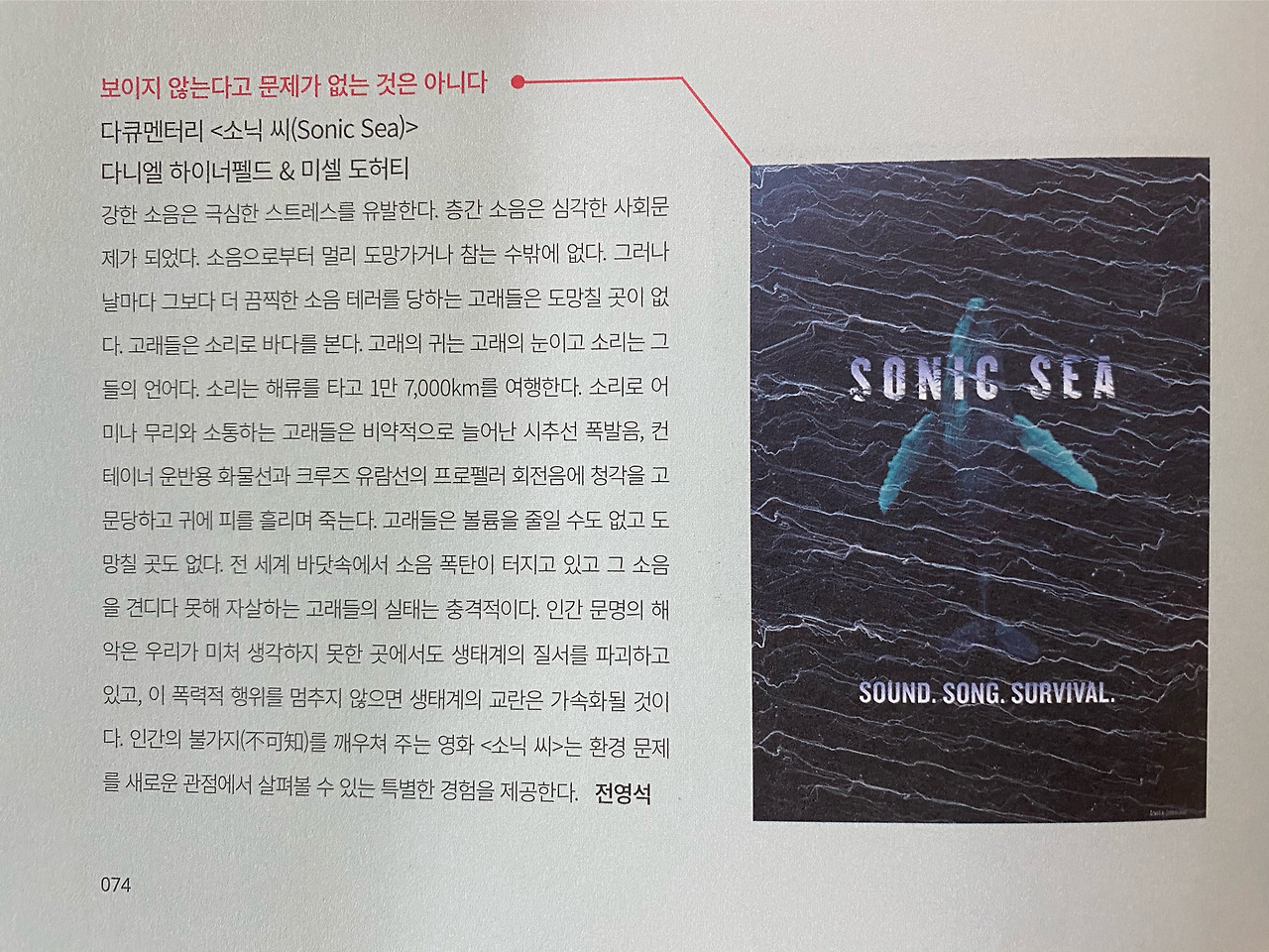 강한 소음은 극심한 스트레스를 유발한다. 층간 소음은 심각한 사회 문제가 되었다. 소음으로부터 멀리 도망치거나 참는 수밖에 없다. 그러나 날마다 그보다 더 끔찍한 소음 테러를 당하는 고래들은 도망칠 곳이 없다. 고래들은 소리로 바다를 본다. 고래의 귀는 고래의 눈이고 소리는 그들의 언어다. 소리는 해류를 타고 17,000km를 여행한다. 소리로 어미나 무리와 소통하는 고래들은 비약적으로 늘어난 시추선 폭발음, 컨테이너 운반용 화물선과 크루즈 유람선의 프로펠러 회전음에 청각을 고문당하고 귀에 피를 흘리며 죽는다. 고래들은 볼륨을 줄일 수 없고 도망칠 곳도 없다. 전 세계 바닷속에서 소음 폭탄이 터지고 있고 그 소음을 견디다 못해 자살하는 고래들의 실태는 충격적이다. 인간 문명의 해악은 우리가 미처 생각하지 못한 곳에서도 생태계의 질서를 파괴하고 있고, 이 폭력적 행위를 멈추지 않으면 생태계의 교란은 가속화될 것이다. 인간의 불가지(不可知)를 깨우쳐 주는 영화 <소닉 씨>는 환경 문제를 새로운 관점에서 살펴볼 수 있는 특별한 경험을 제공한다.