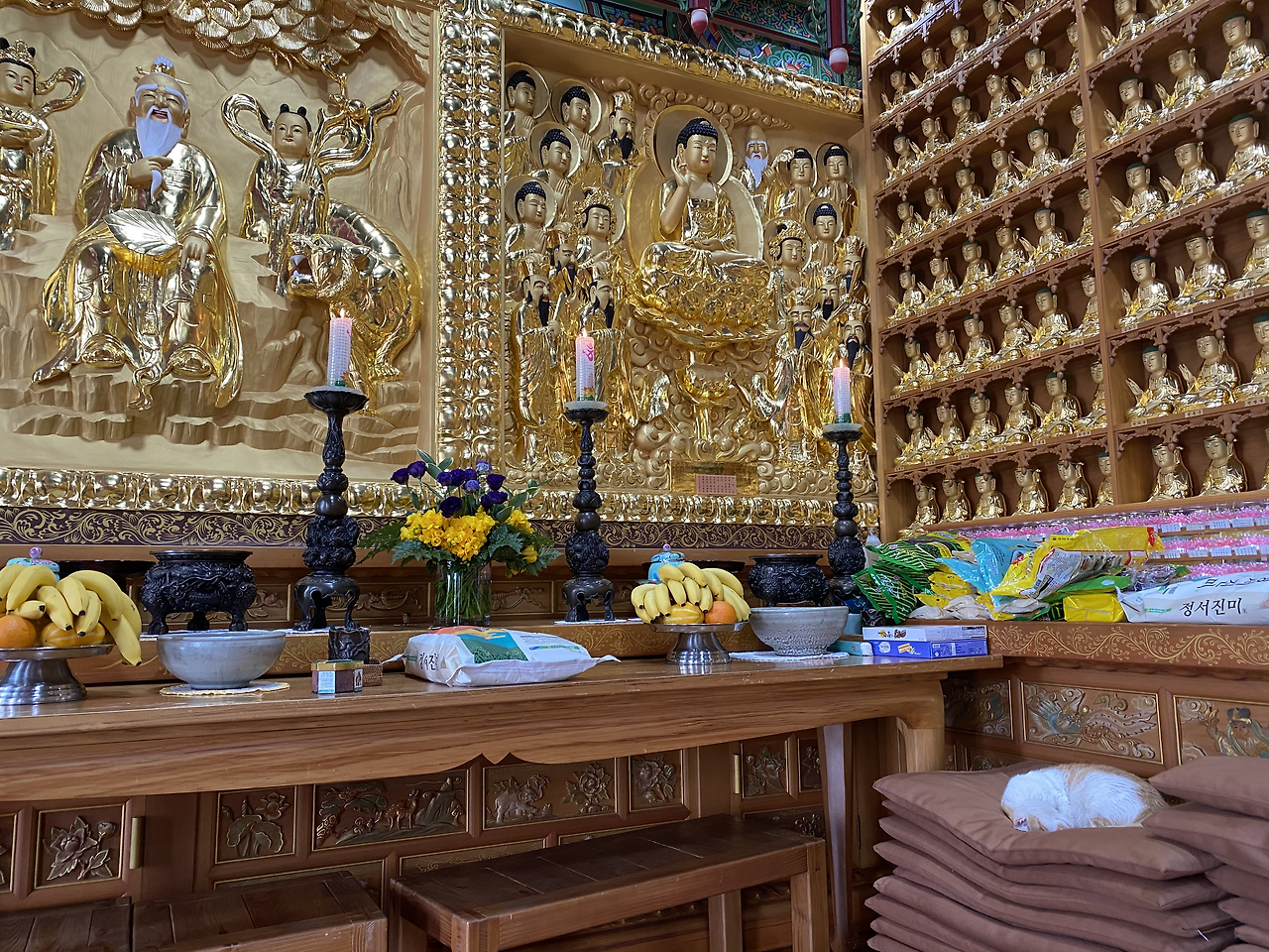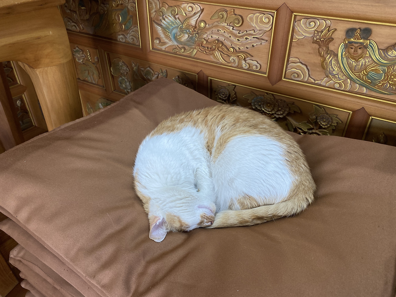석가탄신일 법요식이 5월 말로 연기됐다고 해서 오후 느지막이 산책 겸 절에 갔더니 법당에 사람이 아무도 없네? 잘 됐다 싶어서 단상에 천 원짜리 몇 장 올려놓고 가족들 건강과 영면에 든 엄마, 장인 장모님 극락왕생을 빌며 절을 했는데, 절 하다 방석 위에 뭔가를 얼핏 본 것 같아서 고개를 들어 보니 고양이 녀석이 동그랗게 몸을 말고 열반에 든 부처님 같은 표정으로 오수에 젖어있네? 하... 귀엽고 기가 막혀서 한참을 보다가 부처님이 석탄일에 절간 고양이 낮잠에 깃들어 이렇게 오셨나 보다 싶어서 싱긋 웃음이 나오네? 하긴... 부처님이 어디 절에만 있겠어? 정원 댓돌 물속 플라스틱 금붕어나, 갸르릉거리며 잠에 빠진 봄 고양이 수염과 꿈속에 잠깐 깃들어 왔다 가시기도 할 거야, 암. ^__^