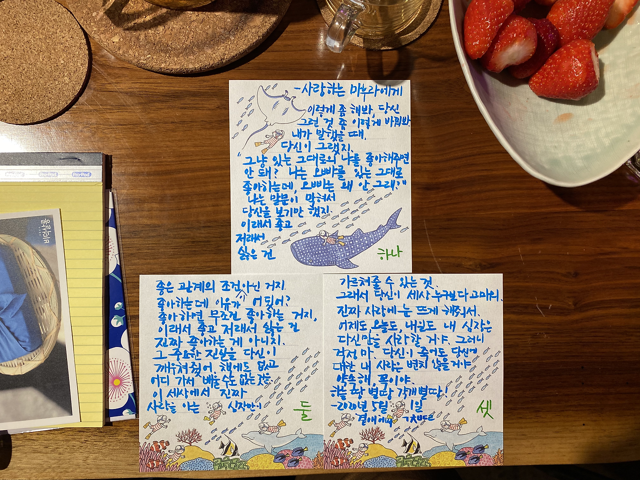 지난 1일 손 편지 모임에서 쓴 편지였다. 맛있는 저녁을 먹은 후 여럿이 모여 누군가에게 띄우는 사적인 편지를 쓴다기에 몹시 쑥스럽고 어색했는데, 편지를 쓰기 시작한 지 얼마 지나지 않아 나는 그 시간의 숨소리, 그 공간의 밀도 높은 공기와 사랑에 빠졌다. 엄마에게 편지를 쓰던 정윤 씨가 조용히 눈물을 곱씹어 삼킬 때부터였다.