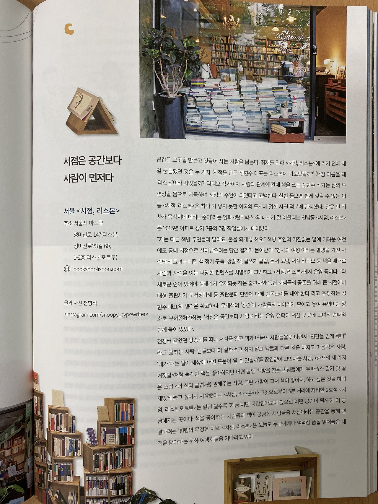 전쟁터 같았던 방송계를 떠나 서점을 열고 책과 더불어 사람들을 만나면서 “인간을 믿게 됐다”라고 말하는 사람, 남들보다 더 잘하려고 하지 말고 남들과 다른 것을 하자고 마음먹은 사람, ‘내가 하는 일이 세상에 어떤 도움이 될 수 있을까’를 끊임없이 고민하는 사람, <존재의 세 가지 거짓말>처럼 묵직한 책을 좋아하지만 어떤 날엔 책방을 찾은 손님들에게 츄파춥스 딸기 맛 같은 소설 <더 셜리 클럽>을 권해주는 사람. 그런 사람이 그저 책이 좋아서, 하고 싶은 것을 하며 재밌게 놀고 싶어서 시작했다는 <서점, 리스본>과 그곳으로부터 5분 거리에 자리한 2호점 <서점, 리스본포르투>는 알면 알수록 ‘지금 어떤 공간인가보다 앞으로 어떤 공간이 될까’가 더 궁금해지는 곳이다. 책을 좋아하는 사람들과 책이 궁금한 사람들을 서점이라는 공간을 통해 연결하려는 ‘힐링의 무정형 허브’ <서점, 리스본>은 오늘도 누구에게나 넉넉한 품을 열어놓은 채 책을 좋아하는 문화 여행자들을 기다리고 있다.