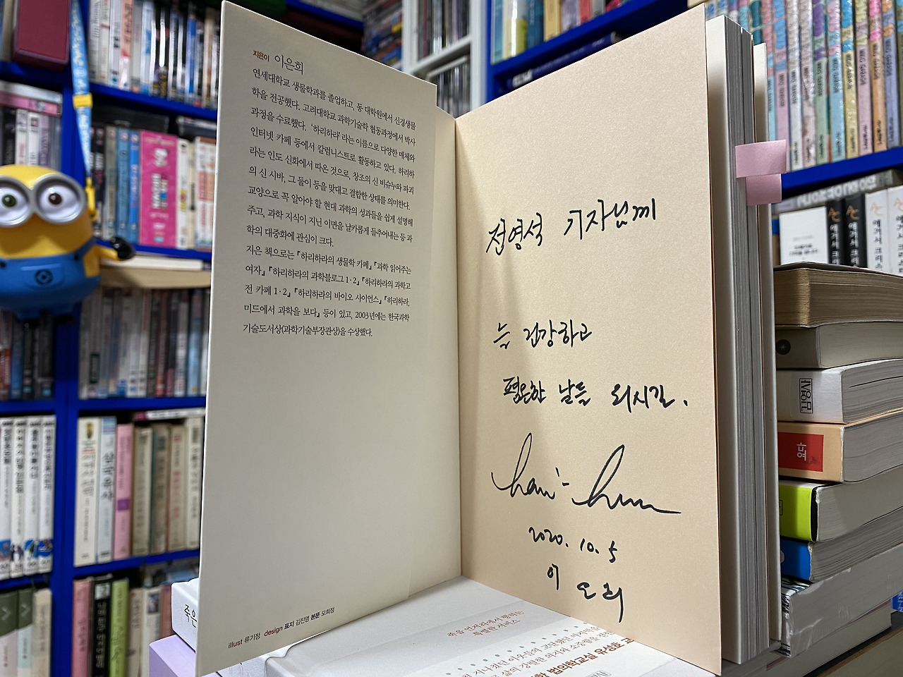 '과학 커뮤니케이터' 영역에 과학 저술가, 강연자뿐 아니라 스토리텔러(SF 소설, 과학 만화가 학습 만화 교양 만화)와 과학 크리에이터(유튜버)까지 포함시킨 포용성과 확장성에도 놀랐습니다. 과학의 학문적 권위를 앞세우기보다 대중에게 한 발 더 다가가기 위한 노력이 느껴졌거든요. 책방으로 리모델링 하면서 그곳에 살던 길고양이들을 보듬어 안고 책방 현관문 앞에 늘 사료와 물을 담은 밥그릇을 놓아둔 모습이 취재가 끝난 후에도 내내 잊히지 않습니다. 생명에 대한 존중과 너그러운 따뜻함이 과학책방 <갈다>를 지탱하며 앞으로 나아가게 만드는 힘이 아닐까 생각합니다. 열성적으로 인터뷰에 응해주시고 불쑥 들이 민 낡은 책에 정성껏 친필 사인을 해주신(저는 기자라 불리기 민망한 사람입니다만? ㅎ) 이은희 이사님에게 마음 깊은 감사를 전합니다.