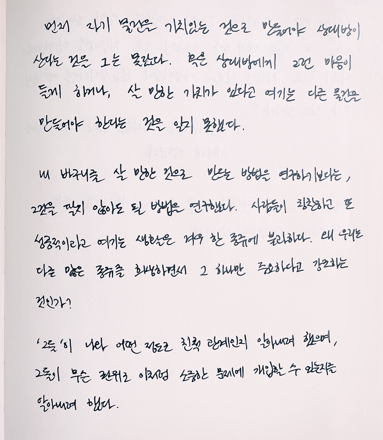 필사의 즐거움도 알게 되었어. 그래서 남들이 다 하는 필사가 아니라, 이번에는 진짜로 나를 위한 필사를 했어. 필사를 해두면, 기억하기가 쉬워. 그리고 그 문구를 쓰면서, 읽었던 부분들 중 인상 깊은 문구를 다시 생각하게 돼. 그 문장의 의미가 무엇인지 이해할 수 없었는데, 필사를 하다 보니 자연스럽게 와닿은 적도 있어. 그리고 이 문장이 나에게 어떤 울림을 주었는지가 명확해져. 예전에도 몇 번 책을 읽고 필사를 했었지만, 그땐 한창 필사와 캘리그래피 열풍이라 해본 건데 재미도 없고 지루했어. 이제야 필사의 재미와 필요를 알게 되었어.
