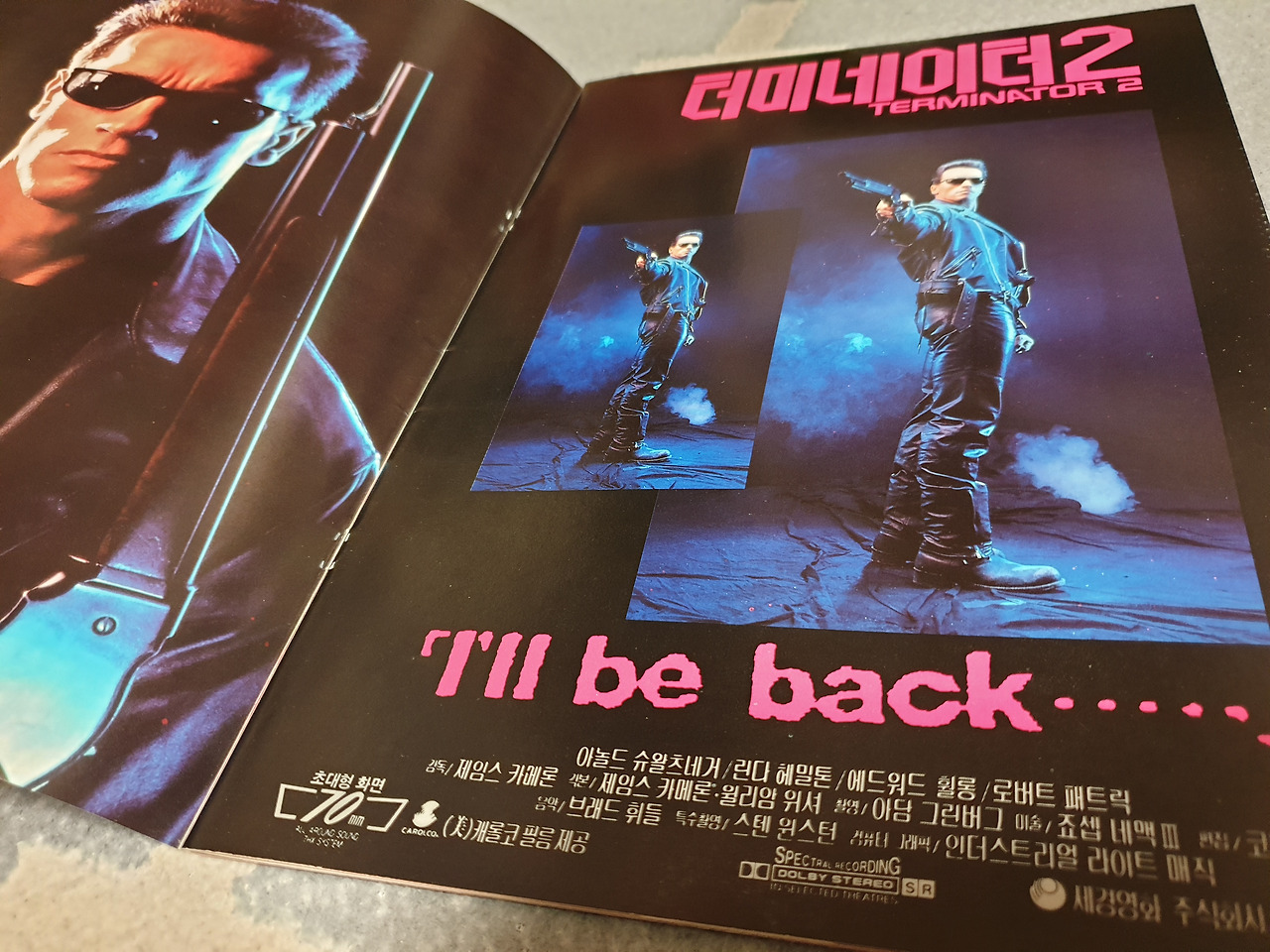 영화 팜플렛 내부는 <프레데터>에 비해서는 조금 나아진 듯한 느낌도 든다. 우선은 올 칼라이고, 내용도 많이 늘었다. 아마도 '아놀드 슈왈제네거'외에는 인지도가 별로 없었던 <프레데터>와는 달리 이미 성공한 전작인 <터미네이터>의 속편이면서 거대한 제작비와 해외에서도 술렁일 만큼의 기대작이었기 때문인 것 같다. 실제로 91년도 당시에 TV에서는 영화 프로에서도 계속 다루어주었고, 예고편도 많이 등장했었으니까.