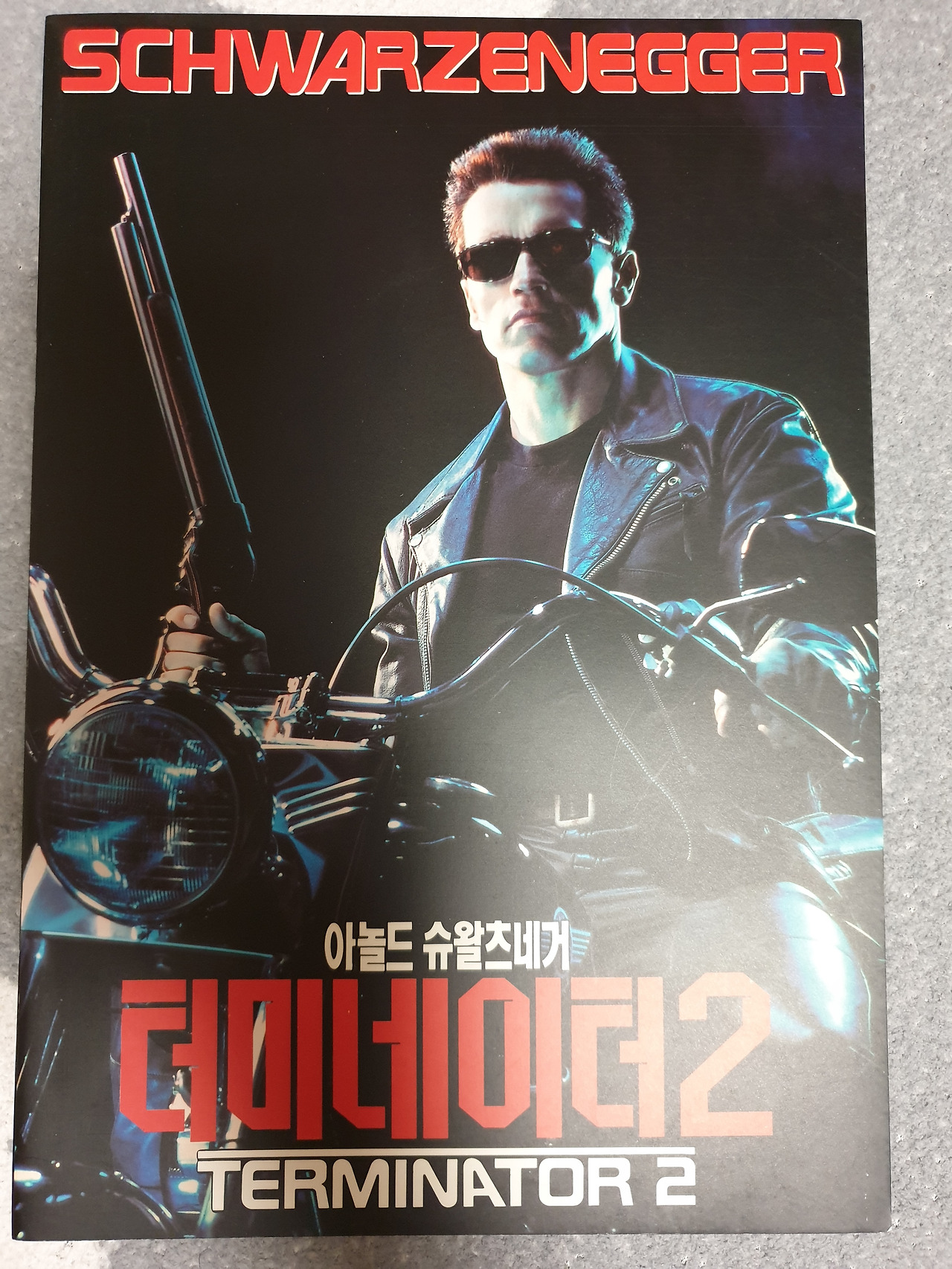 <터미네이터 2> 영화 팜플렛도 '아놀드 슈왈제네거'를 전면에 내세우고 있다. 커버는 '아놀드 슈왈제네거'의 단독 샷이다. 다른 출연진은 필요 없다는 듯한 느낌도 준다. '아놀드 슈왈제네거'의 인지도가 가장 높아서인지, 영화에서의 비중이 높아서인지는 모르겠지만, 팜플렛 내부도 대부분 '아놀드 슈왈제네거'로 채워져 있다. <터미네이터 2>에서 시각적인 충격과 무시무시한 공포감을 주었던 'T-1000'을 거의 다루지 않은 것은 의외이다.