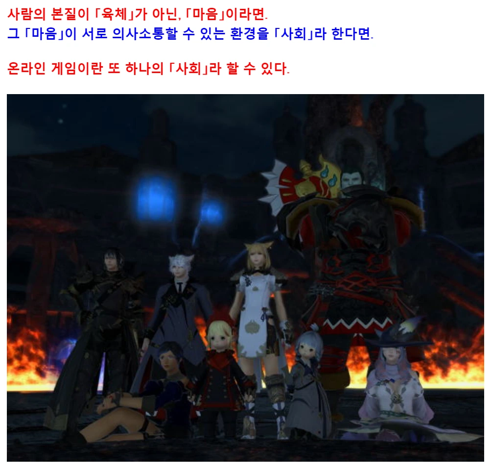 장기적인 관점으로 보았을 때, 파이널 판타지 같은 RPG 게임은 한판에 10분이 채 걸리지 않는 오버워치보다 유저 간 커뮤니케이션이 게임의 재미를 더 크게 좌우합니다. 다른 유저들의 도움을 받아 퀘스트를 달성하고 그룹을 만들어 보스 몬스터를 잡는 과정에서 쌓이는 것은 게임 경험치만이 아닙니다. 게임을 함께 하는 팀원들 사이에서 생겨난 끈끈한 유대감은 실제 사회 못지 않은 다양한 이야기를 만들어냅니다. 게임 속 세상을 제2의 사회라고 부를 수 있는 근거입니다.