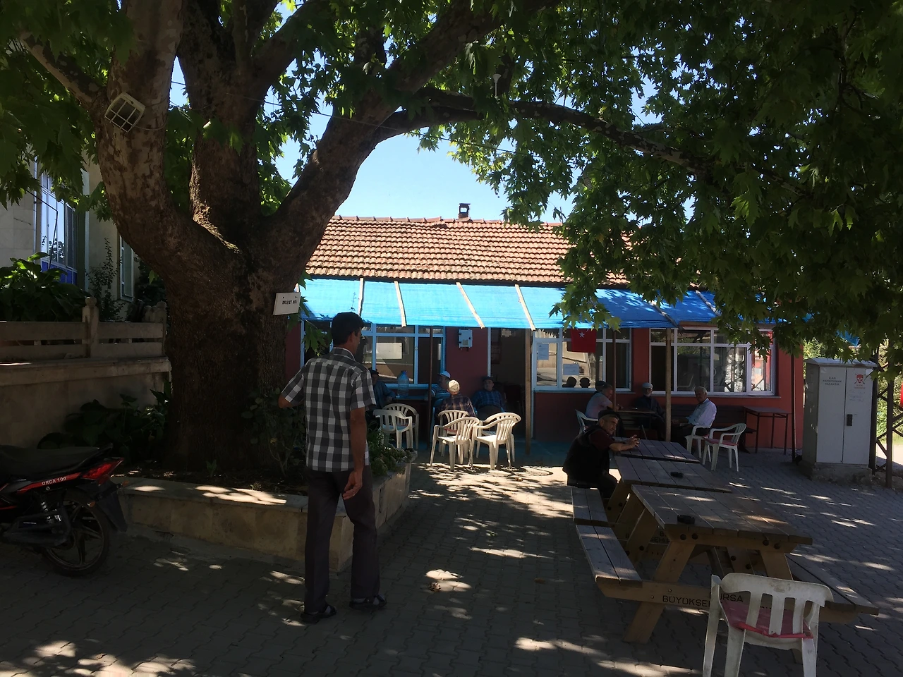 꼬불꼬불한 길들을 지나 한참 달리니 길 오른편에 작은 마을 전용 묘지와 함께 마을 입구가 나왔다. 마을 입구 왼편엔 지금은 텅 빈 작은 진료소가 있었고, 길을 따라 조금 더 들어가니 공터가 나왔다. 택시는 공터에 우리를 내려줬다. 공터엔 아름드리 플라타너스나무가 있었고 마을의 카흐베(kahve)가 있었다.