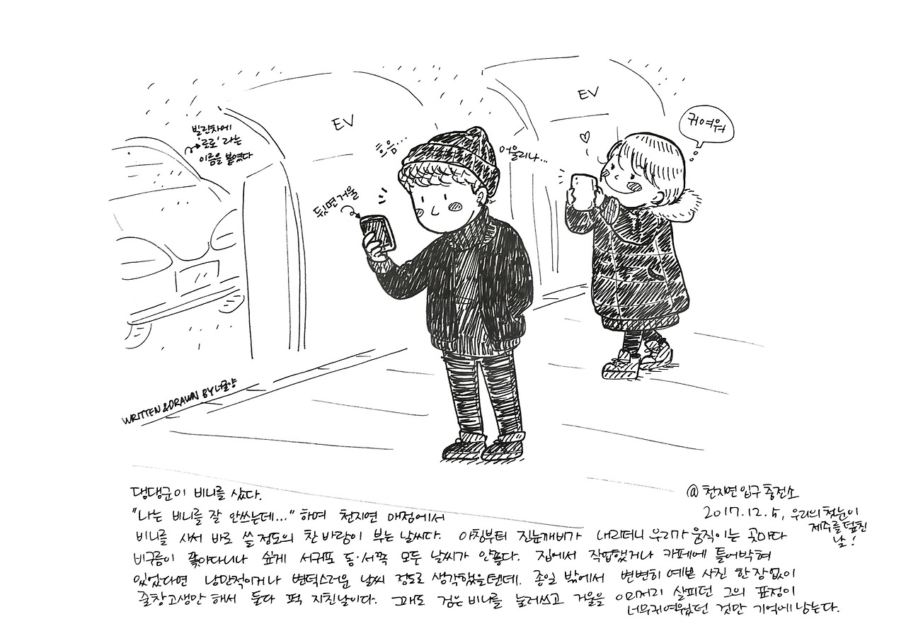 귀갓길에 천지연에 들러 전기차 충전을 하다 그가 머리가 시리다고 검은색 비니를 샀다.