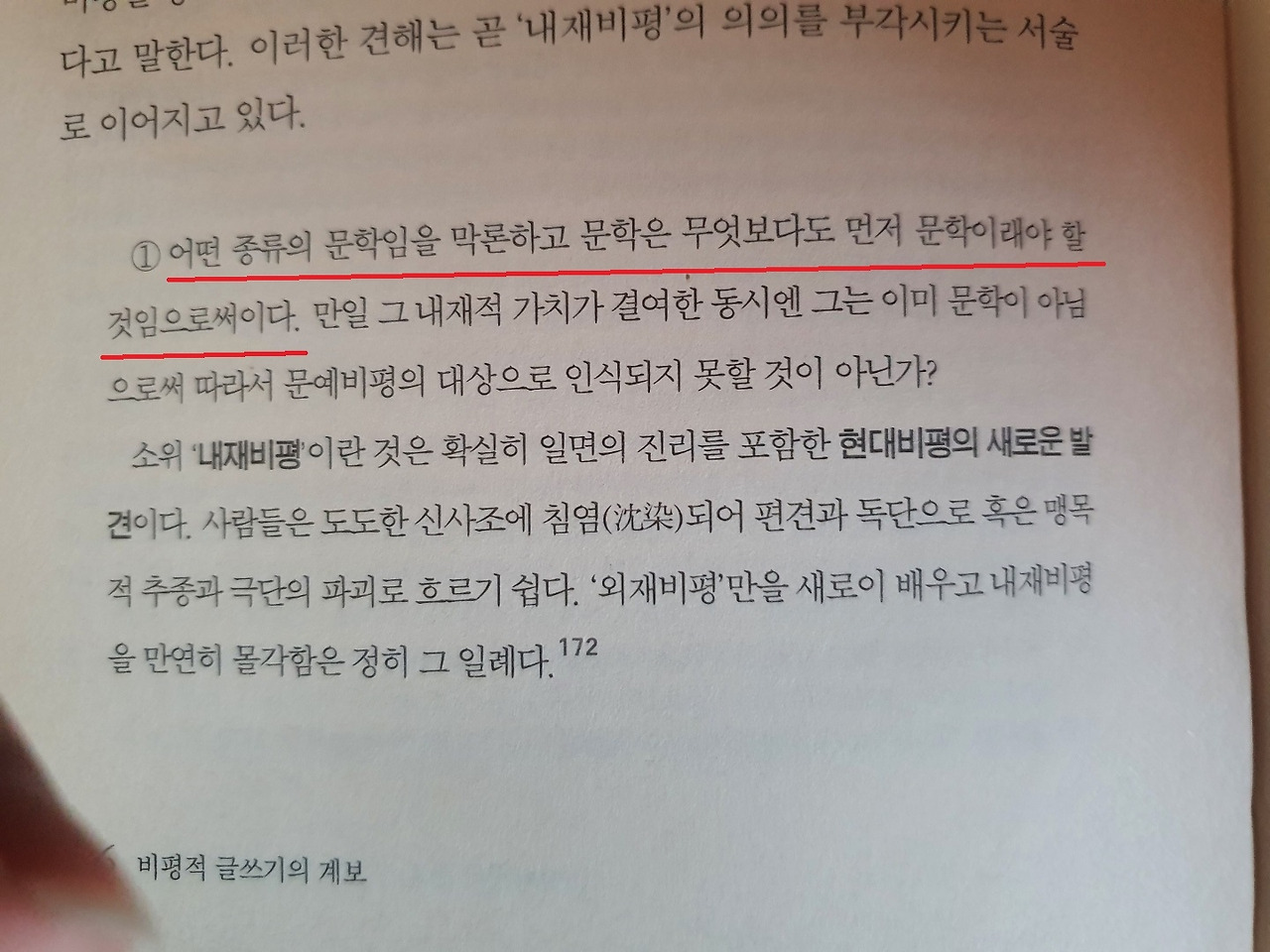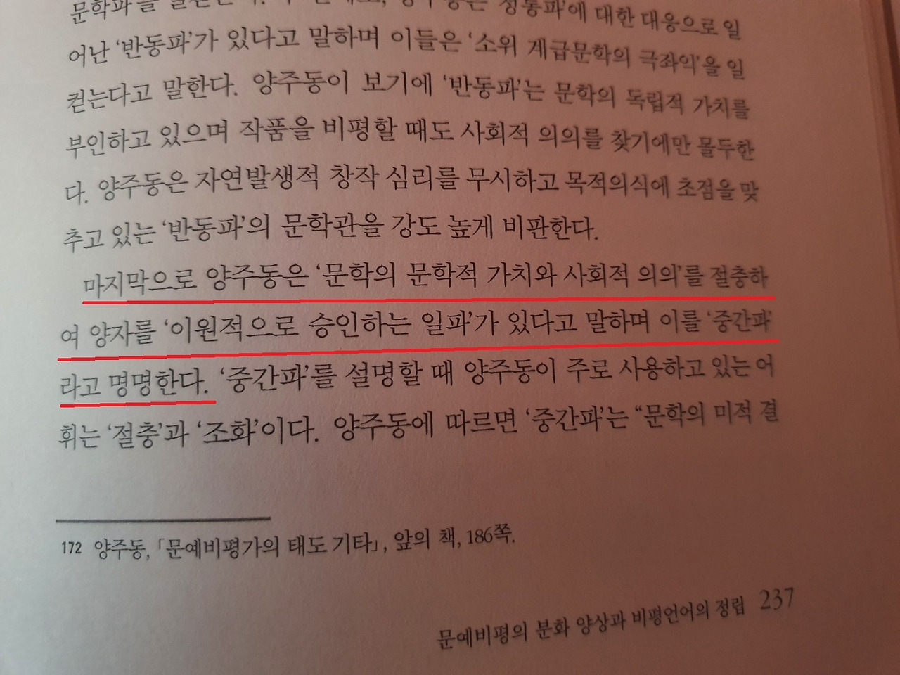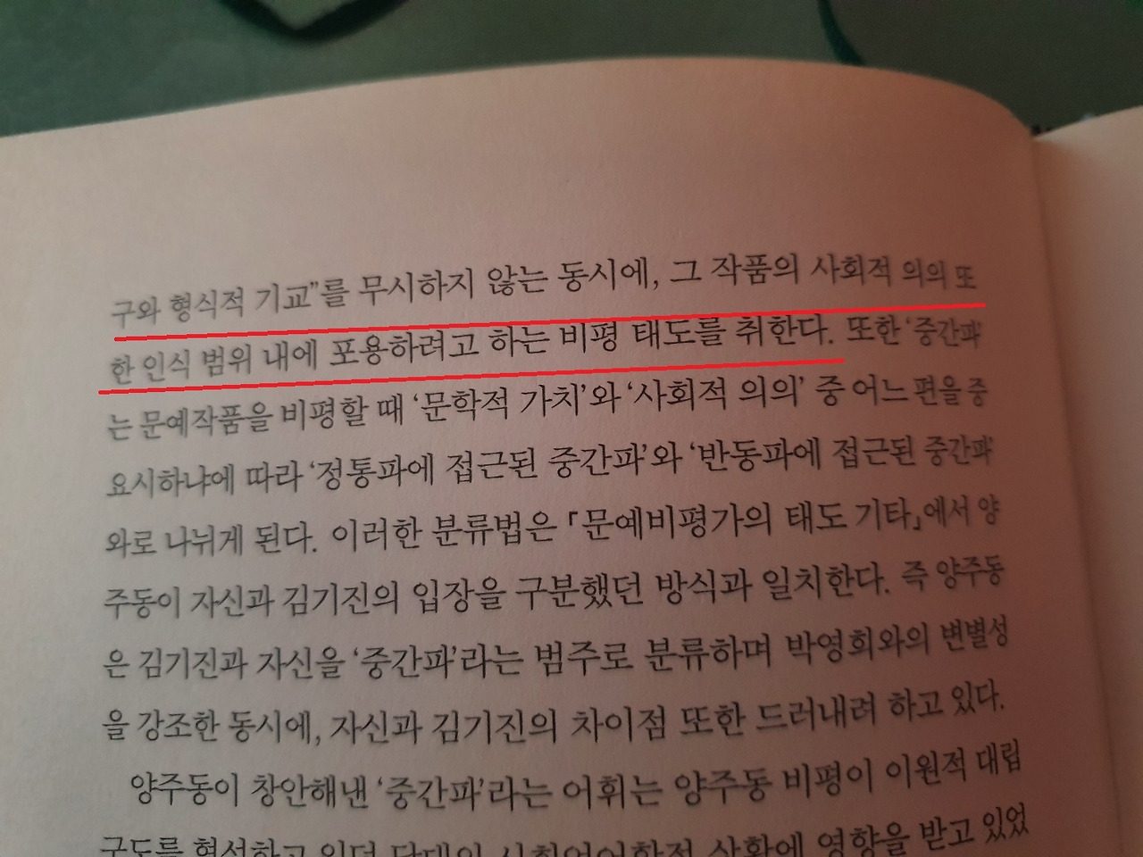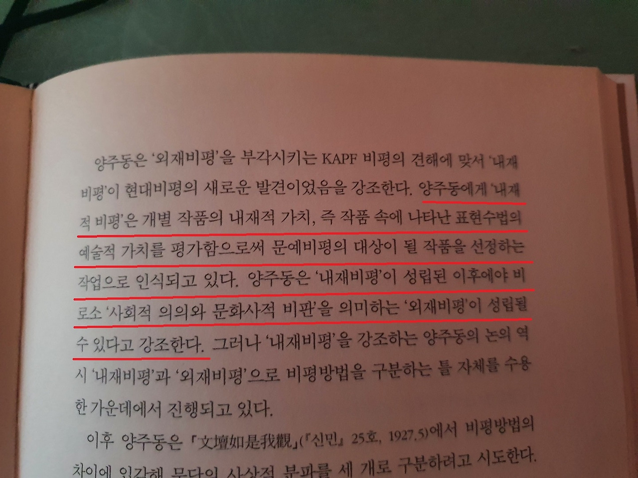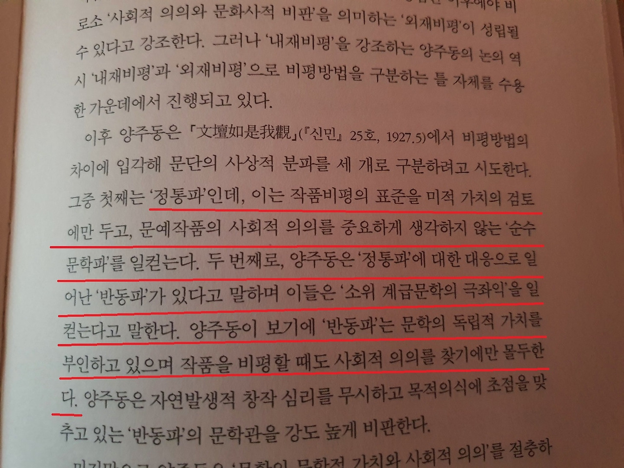 최근에 문예비평의 계보에 관한 책을 읽어보고 있다. 읽는 와중에 흥미로운 대목이 눈에 들어와서 소개해보고자 한다. 양주동이라는 국문학자의 입장인데, 이 분은 문예비평의 이원론을 주장한다. 우선 이분의 기준에 따르면 문예비평은 내재적 비평과 외재적 비평으로 나뉜다. 내재적 비평이란 문학작품 내의 내재적 가치, 즉 작품 내에 존재하는 표현 수단의 예술적 가치 등을 판단하는 작업이라면 외재적 비평은 작품의 외재적 가치, 즉 작품이 지니고 있는 사회적 의의를 평가하는 작업이라고 할 수 있겠다. 문예비평의 이원론이란, 문학의 내재적 가치를 우선적으로 평가하여 이 작품이 문예비평의 대상에 들 수 있는지를 평가한 후, 해당 작품의 사회적 의의를 평가함으로써 외재적 가치 역시도 잡아보고자 하는 것이다.
