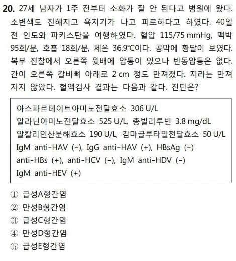 예컨대, 아래 문제와 같은 환자를 제가 실제 의료 현장에서 만난다면, 증상만으로 간염을 의심할 수 있을 거라 저조차 생각지 않습니다(아직은요). 하지만 문제처럼 간염을 이미 의심해 바이러스 검사가 모두 이루어진 상태에서는 누구라도 답을 쉽게 고를 수 있을 것입니다.
