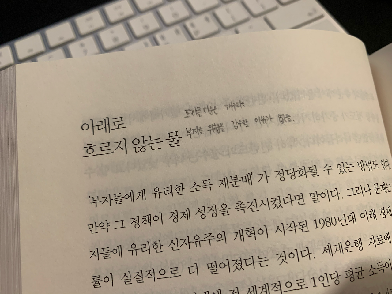 요즘 읽고 있는 "그들이 말하지 않는 23가지"라는 책에는 위의 사진에서처럼 메모가 그득하다. 중요한 문단에는 큰따옴표도 들어가 있고, 핵심 단어에는 동그라미, 밑줄, 목적지 없는(없었던) 질문들이 적혀있다. 이런 식으로 열심히 읽는 습관을 꾸준히 가지기 쉽지 않다. 그렇기에 몇 장 안 읽고 메모를 그만두지 않을까 싶었는데, 어느덧 거의 끝장에 가까워져 가는데도 메모와 질문이 멈추질 않는다. 이 전 주인, 대단한 사람이다. 왠지 지고 싶지 않은 질투심과 존경심이 같이 들고, 내 생각과 이 사람의 생각이 같은지 다른지 궁금한 마음에 나도 모르게 메모를 찾게 된다.