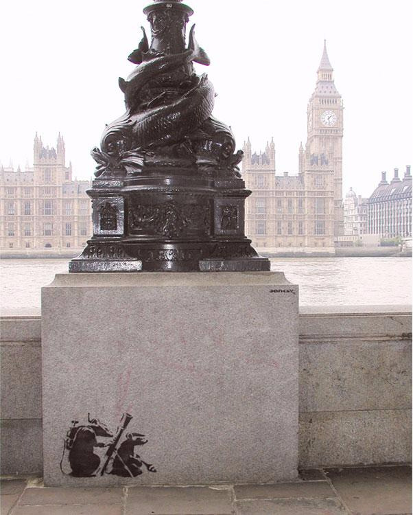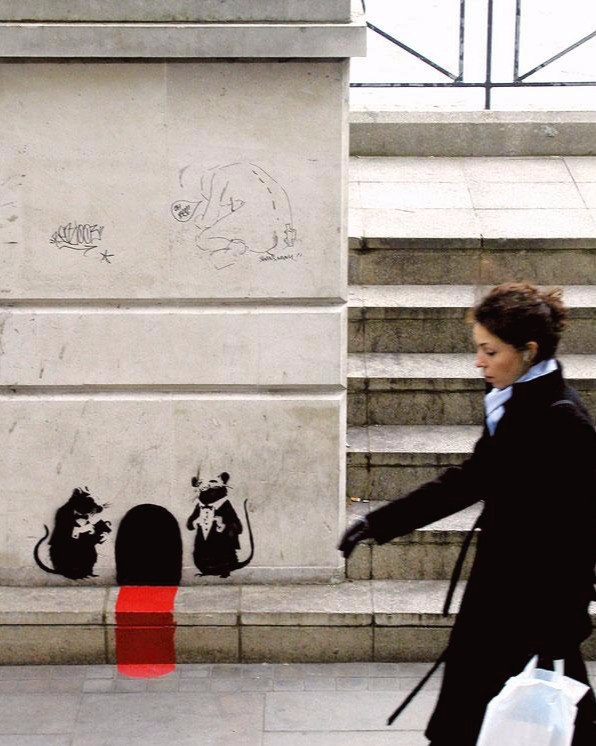그리고 위에는 없지만, 뱅크시의 작품에는 아이들, 유명인들 외에도 '쥐'가 굉장히 자주 등장한다. 뱅크시의 거의 뮤즈 같은 존재랄까. 이러한 이유 때문에 기존의 유명한 그래피티 아티스트 Blek de Rat과 유사하다는 평을 많이 들었다. 그럼에도 뱅크시가 쥐를 소재로 많은 작품을 한 데에는 이유가 있어 보인다. 밤에만 나타나는 쥐의 특성이 뱅크시와 닮았기도 하고, 범죄자 취급받으며 언제나 추방의 대상이 되는 쥐가 그래피티 아티스트의 숙명과도 비슷하다. 또한 뱅크시가 자주 던지는 메시지인 정치나 허세 등의 소재에 우리가 가장 깔보는 동물 쥐가 주인공으로 등장하면서, 이 쥐의 모습이 우리를 거울과도 같이 비치며 반성케 한다.