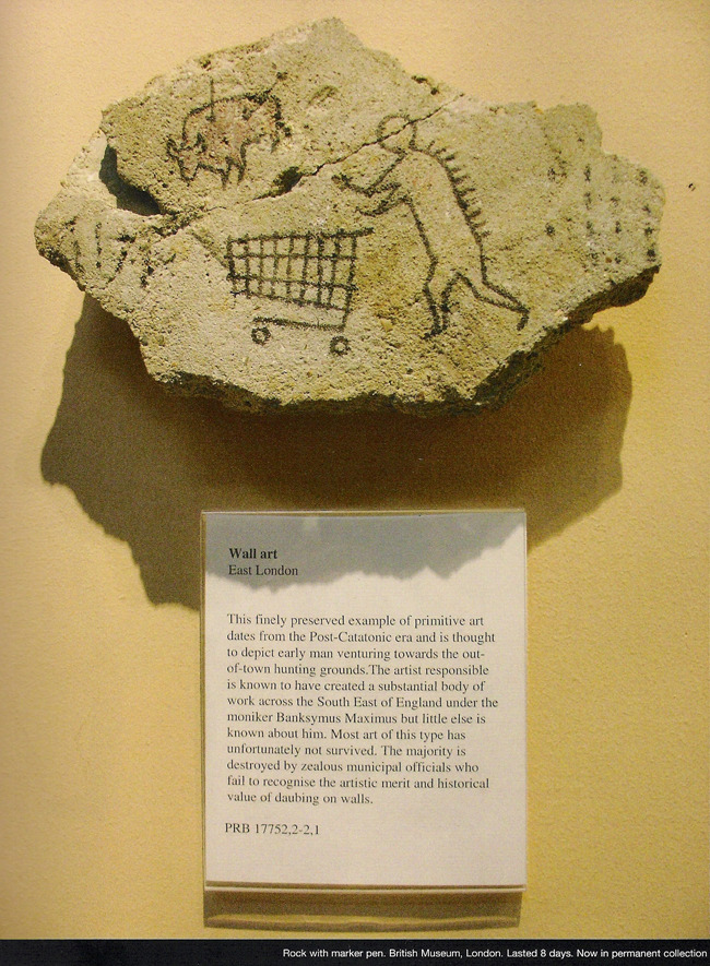 그리고 그는 아마도 사상 최고의 불평 분자가 아닐까 싶다. 그의 비판적인 예술과 관련해서 재미있는 일화들이 많은데, 그중 하나는 예술을 관람하는 관람객들의 오만함에 통쾌하게 복수한 사례이다. 미술 작품을 제대로 감상하지도 않으면서 미술관을 찾는 것만으로 똑똑한 척하는 모든 사람들을 비웃어버린 것이다. 그는 루브르나 대영박물관, MOMA(Museum of Modern Art) 등에 몰래 변장하고 들어가 어처구니없는 자신의 작품을 몰래 진열하고 도망가고는 했다. 쇼핑하는 원시인이 그려진 돌이나 스마일 스티커가 붙여진 모나리자 같은 것들을 말이다. 웃기게도, 이러한 작품들은 짧게는 며칠에서 길게는 거의 한 달 가까이 전시됐다고 한다.