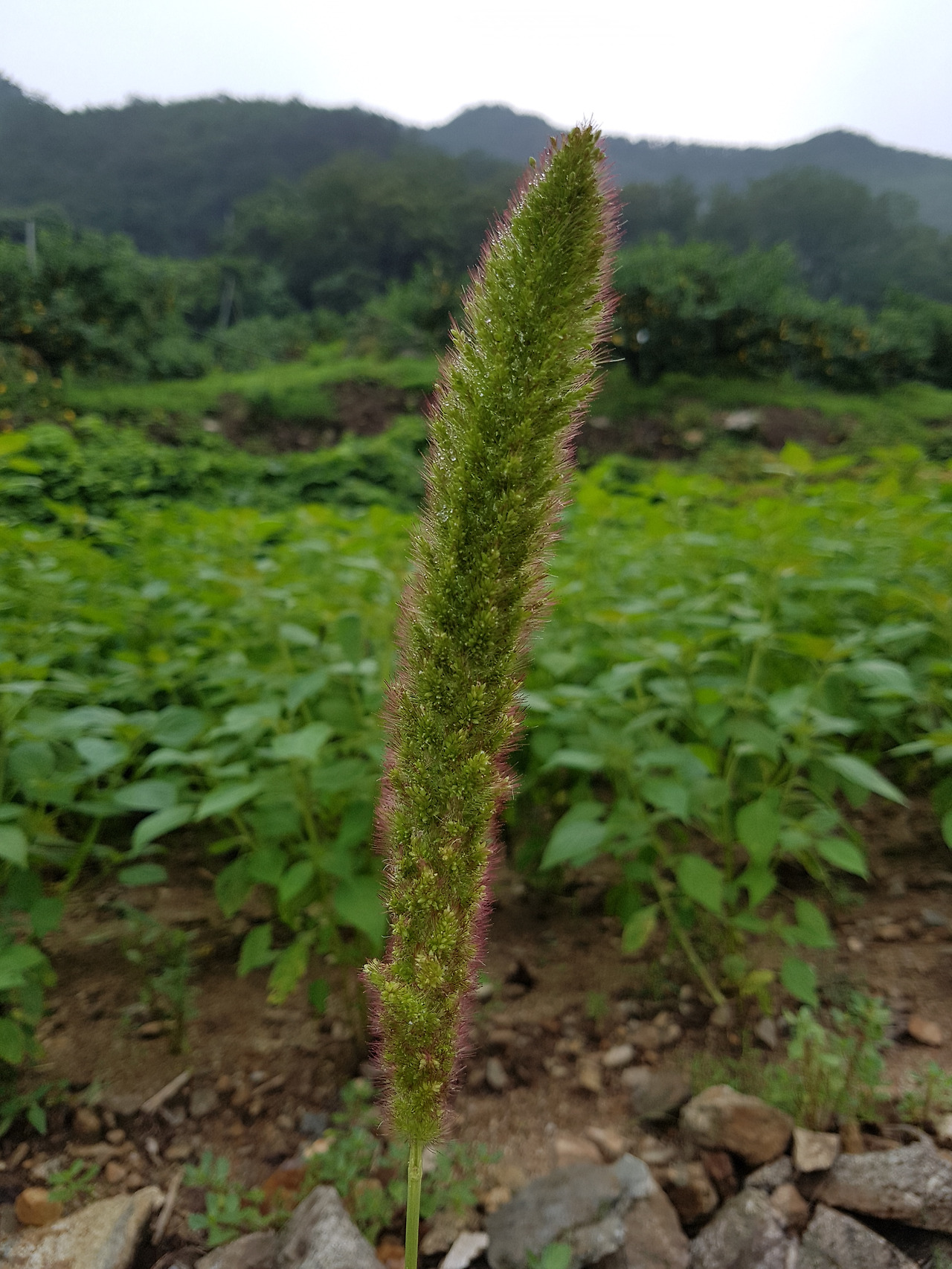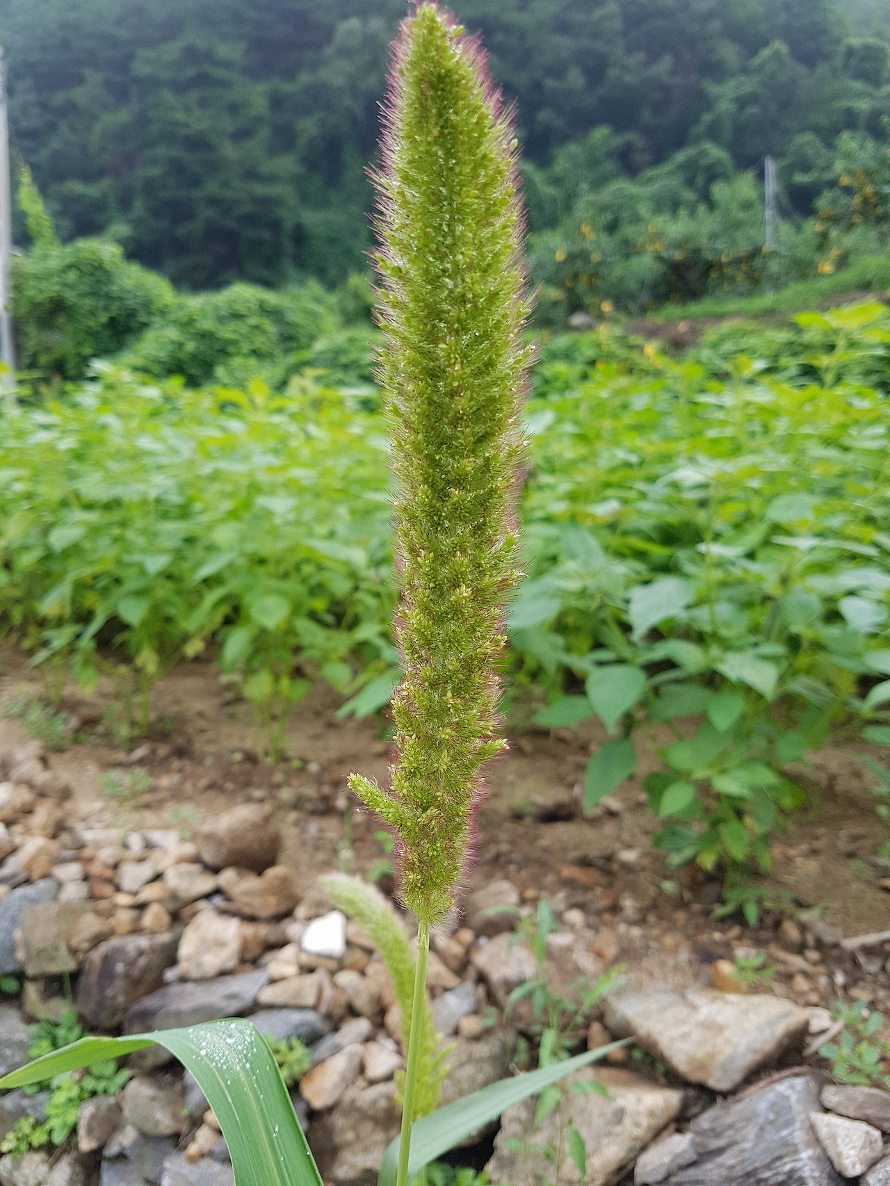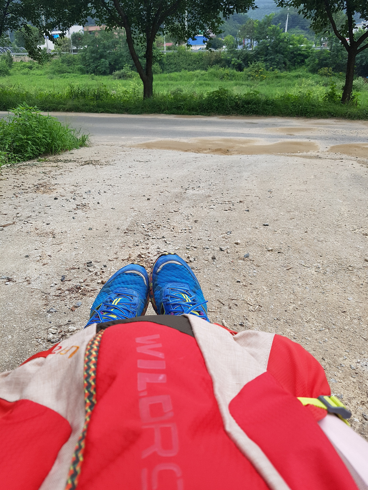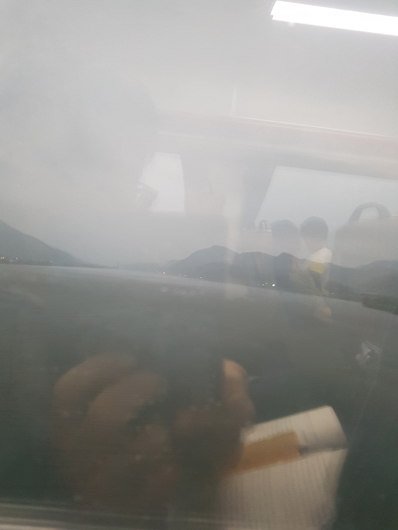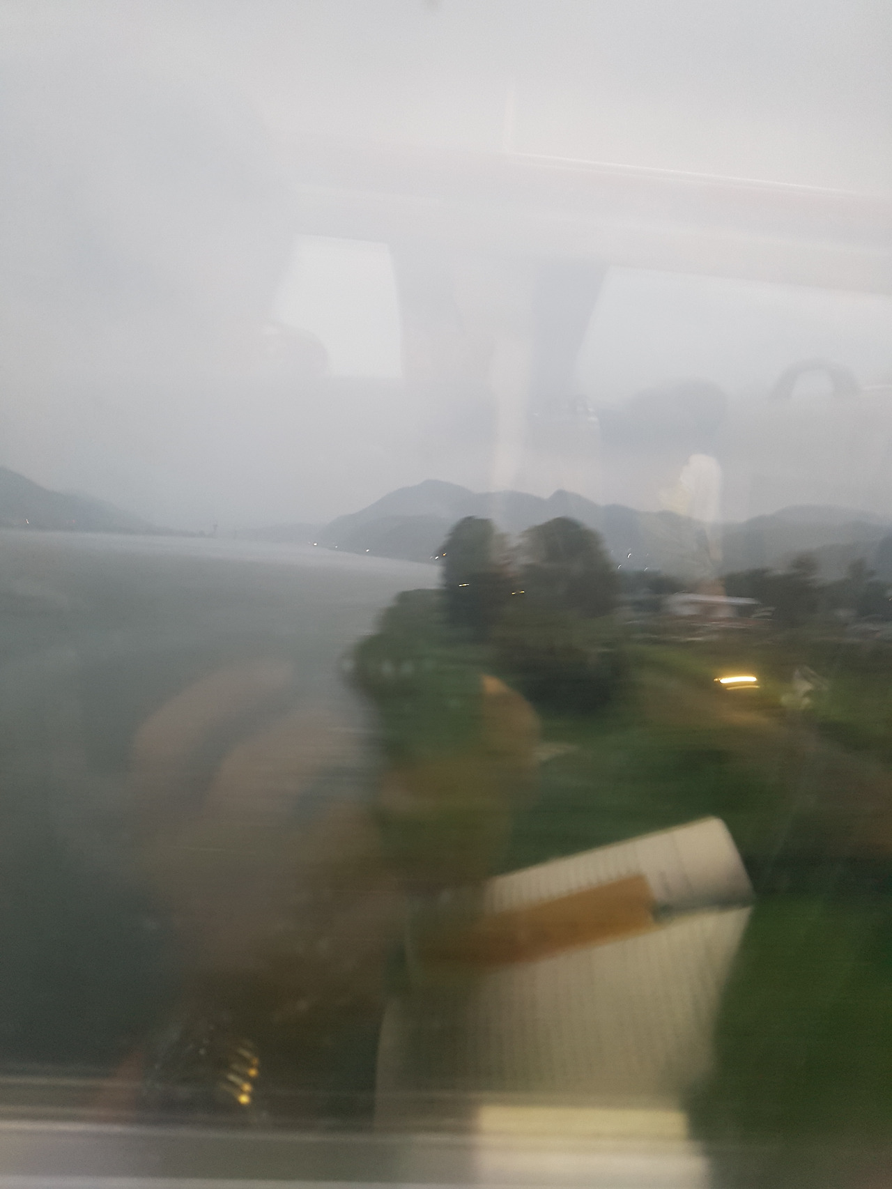 기차 차창 밖에 내리는 비雨가