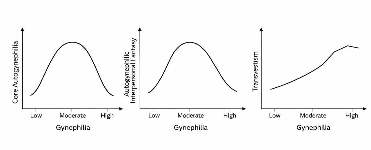 연구 결과는 블랜차드의 예측과 일치했다. 핵심 자기여성애 척도(주로 여성의 몸을 가지는 것에 대하여 흥분하는 경향을 측정함), 그리고 자기여성애적 대인 환상 척도(여성으로서 자신이 타인으로부터 찬사 받는 것에 대하여 성적으로 흥분하는 경향)는 여성애 수준에 대하여 역 U자 형태의 경향성이 관찰되었다.