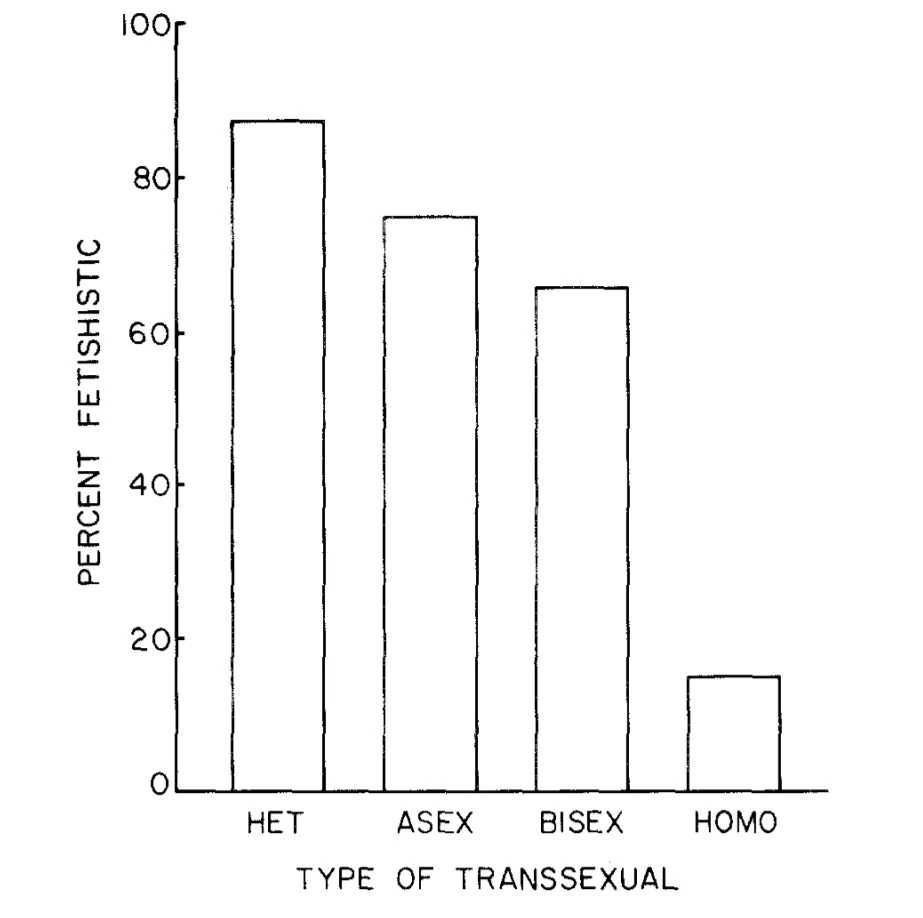 저자는 이러한 하위 유형들이 이성애적 “상위 집단”으로부터 구분되는 것은 두 가지 서로 다른 과정에 의해 이루어진다고 본다. 무성애적 트랜스섹슈얼리즘에서는, 그 기저에 있는 이상 현상인 교차 성별 페티시즘이 여성에 대한 성적 끌림을 압도하거나 그것과 경쟁하게 되어, 개인이 타인에 대해 거의 성적 끌림을 느끼지 않는 것처럼 보이게 된다. 이런 의미에서 그의 이성애성은 잠재적인 상태에 놓여 있다. 양성애적 트랜스섹슈얼이 겉보기로 존재하는 현상을 설명하는 과정은 다소 다르다고 여겨진다. 이러한 개인들에서는 교차 성별 페티시즘으로 나타나는 성적 이상이, 여성으로서 남성과 성교를 하는 환상 속에서도 표현된다. 그러나 실제로 작용하는 성적 자극은, 진정한 동성애적 끌림에서처럼 남성의 신체 그 자체가 아니라, 남성에 의해 삽입되는 환상 속에서 상징화되는 여성으로서의 자신에 대한 생각이다. 이러한 사람들이 상상하는, 혹은 경우에 따라서 실제이기도 한 남성 성적 파트너는, 여성의 의복이나 화장과 마찬가지로, 여성이 되는 환상을 돕고 그것을 강화하는 기능을 수행한다. — Blanchard, 1985, p. 249