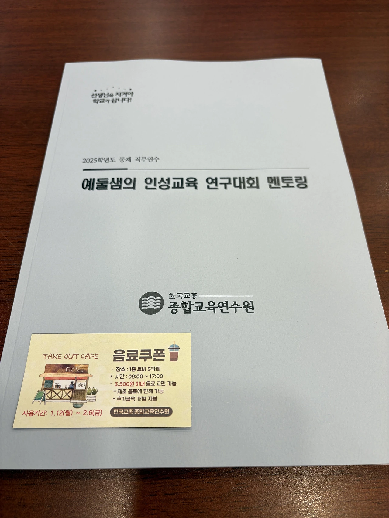 1층 카페에서 쓸 수 있는 3500원 음료 쿠폰도 주셨다. 이틀 연수 양일간 하루에 쿠폰 하나씩, 총 2개를 받을 수 있다. 팁은 2500원짜리 음료를 시켰다면 500원짜리 젤리나 1000원짜리 쿠키 등으로 3500원 금액을 채워쓸 수 있다는 점이다. 그걸 모른 채 그냥 쿠폰을 건네어드렸는데, 옆에서 알차게 챙겨서 쓰시는 선생님을 보고 알게 됐다.