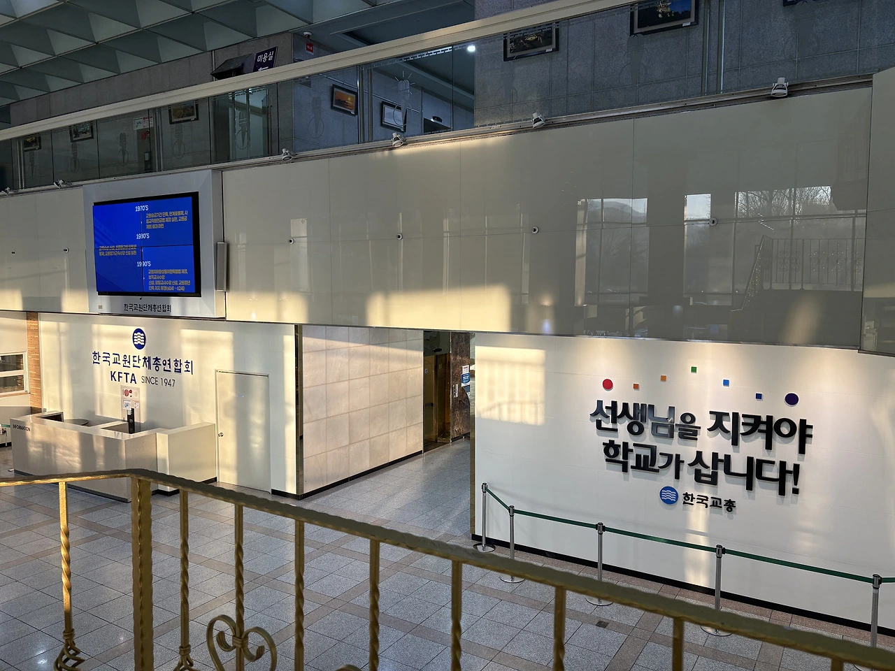 건물 안에 “선생님을 지켜야 학교가 삽니다!”라는 교사를 보호해 주는 분위기의 강력한 한마디가 외벽을 차지하고 있었다.