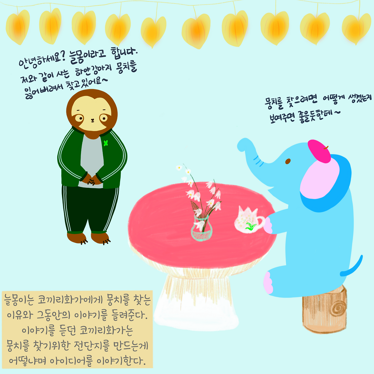 늘몽이의 사정을 알게 된 코끼리화가는 뭉치를 찾기 위해서는 뭉치가 그려진 전단지를 만들면 어떻겠나며 아이디어를 이야기한다.