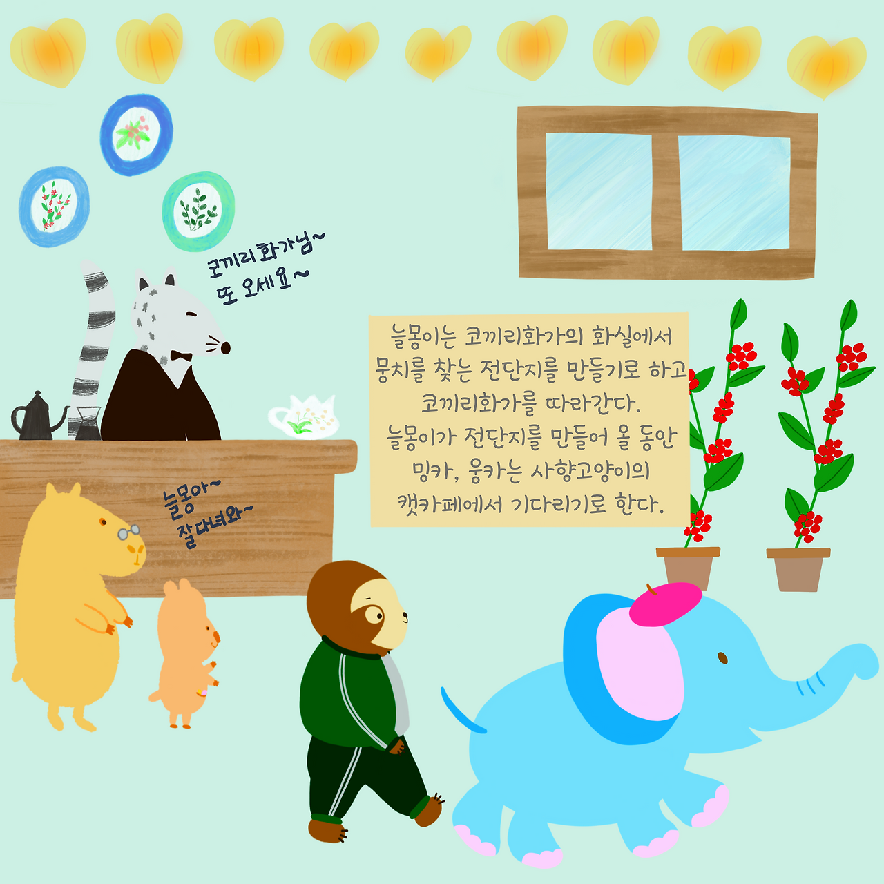 늘몽이는 그렇게 코끼리화가의 화실로 가고 전단지를 만들 동안 밍카와 웅카는 사향고양이의 카페에 남아 혹시 뭉치의 행방을 알지도 모르는 마을 주민을 찾아보기로 한다.