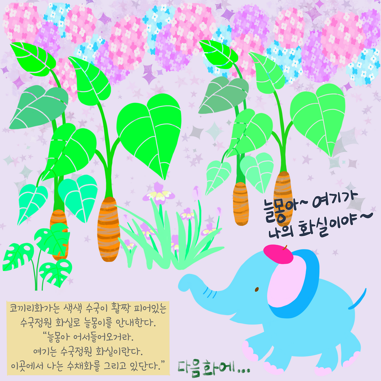 코끼리화가의 화실에 들어선 늘몽이는 색색 수국이 아름답게 피어있는 수국정원화실를 보고 감탄을 하게 되는데...