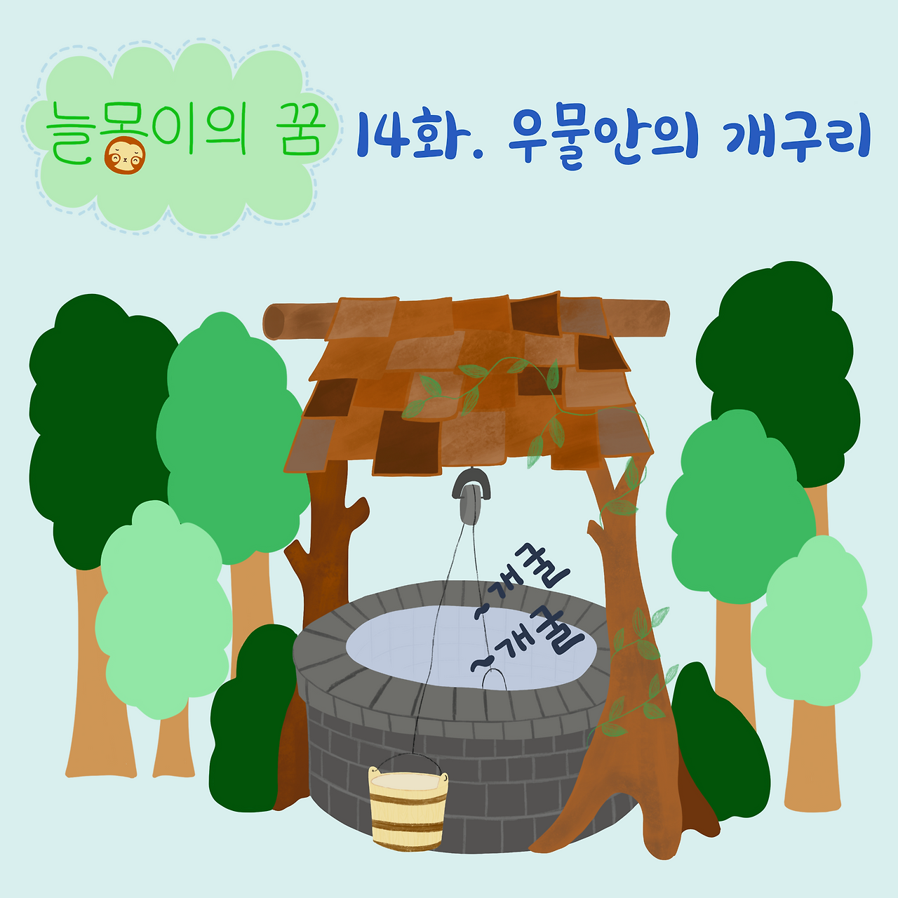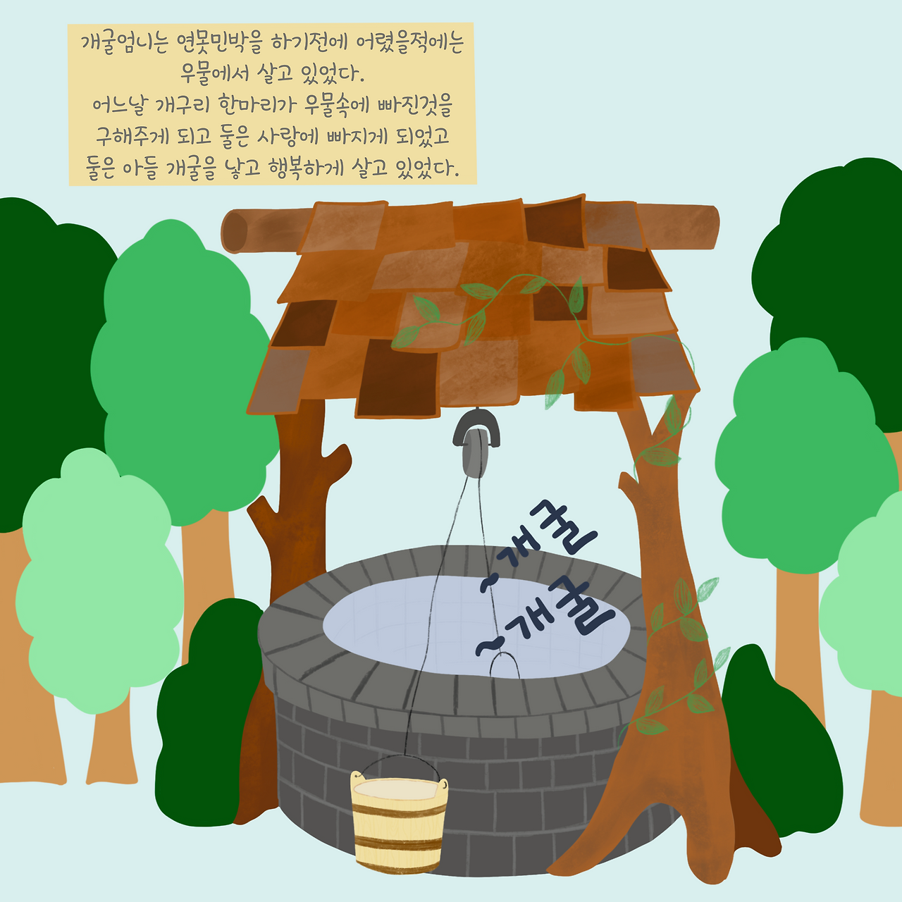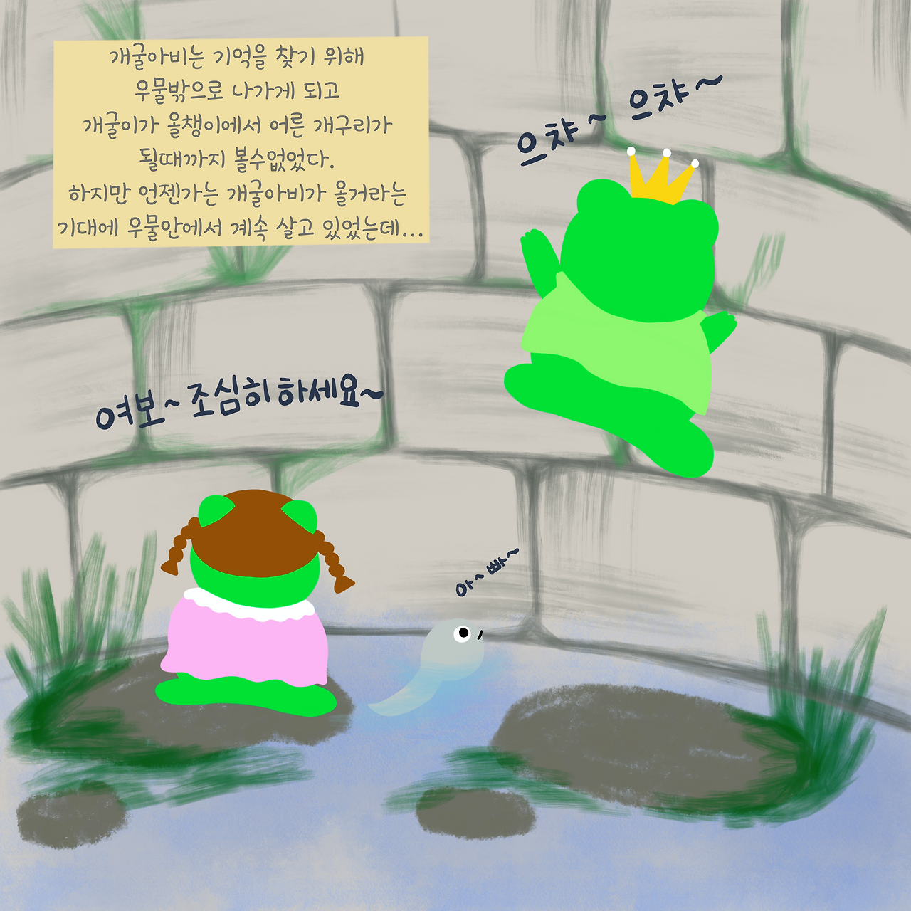 그렇게 개굴아비는 개굴엄니와 아직 올챙이인 개굴이를 두고 우물벽을 기어올라 우물밖으로 나가게 된다.