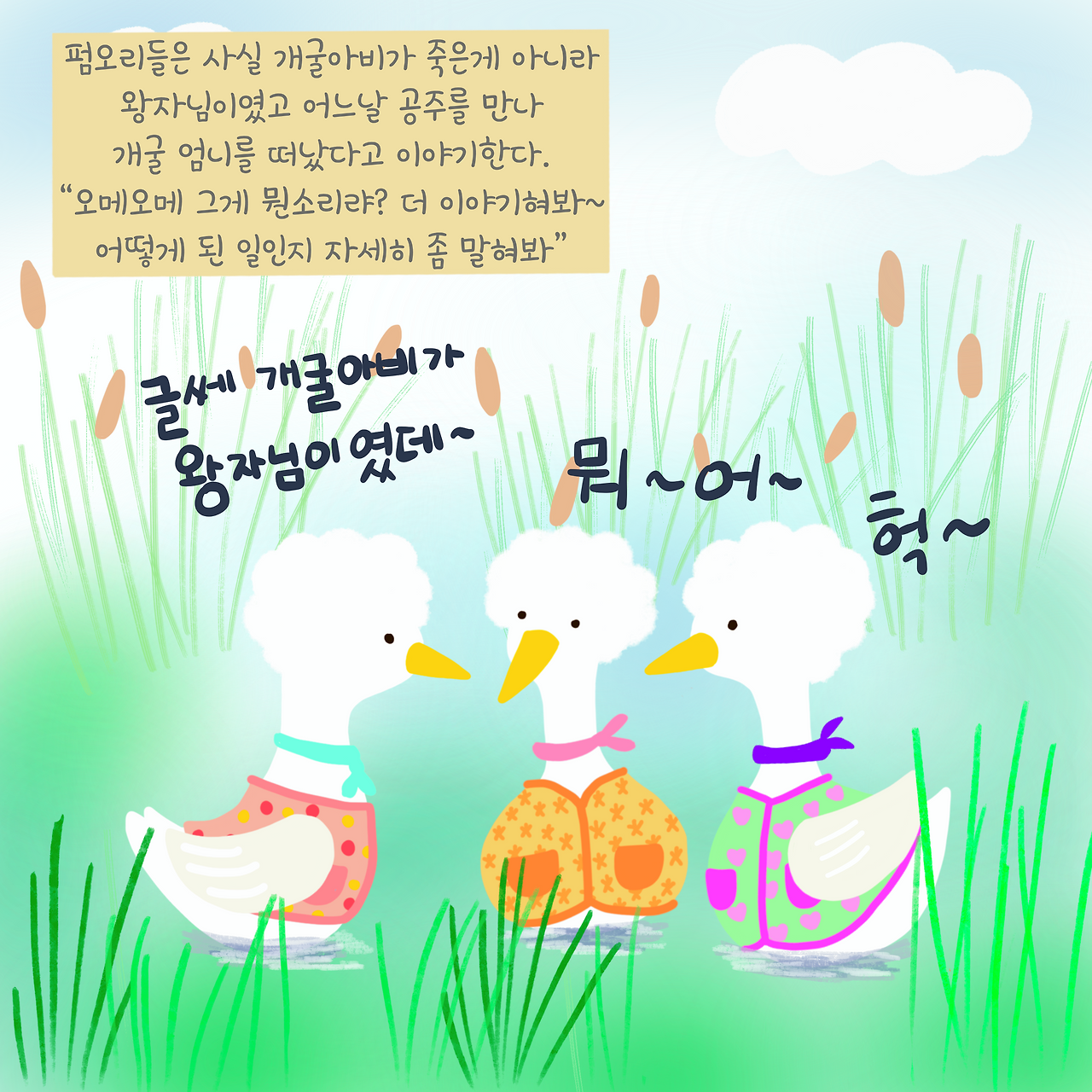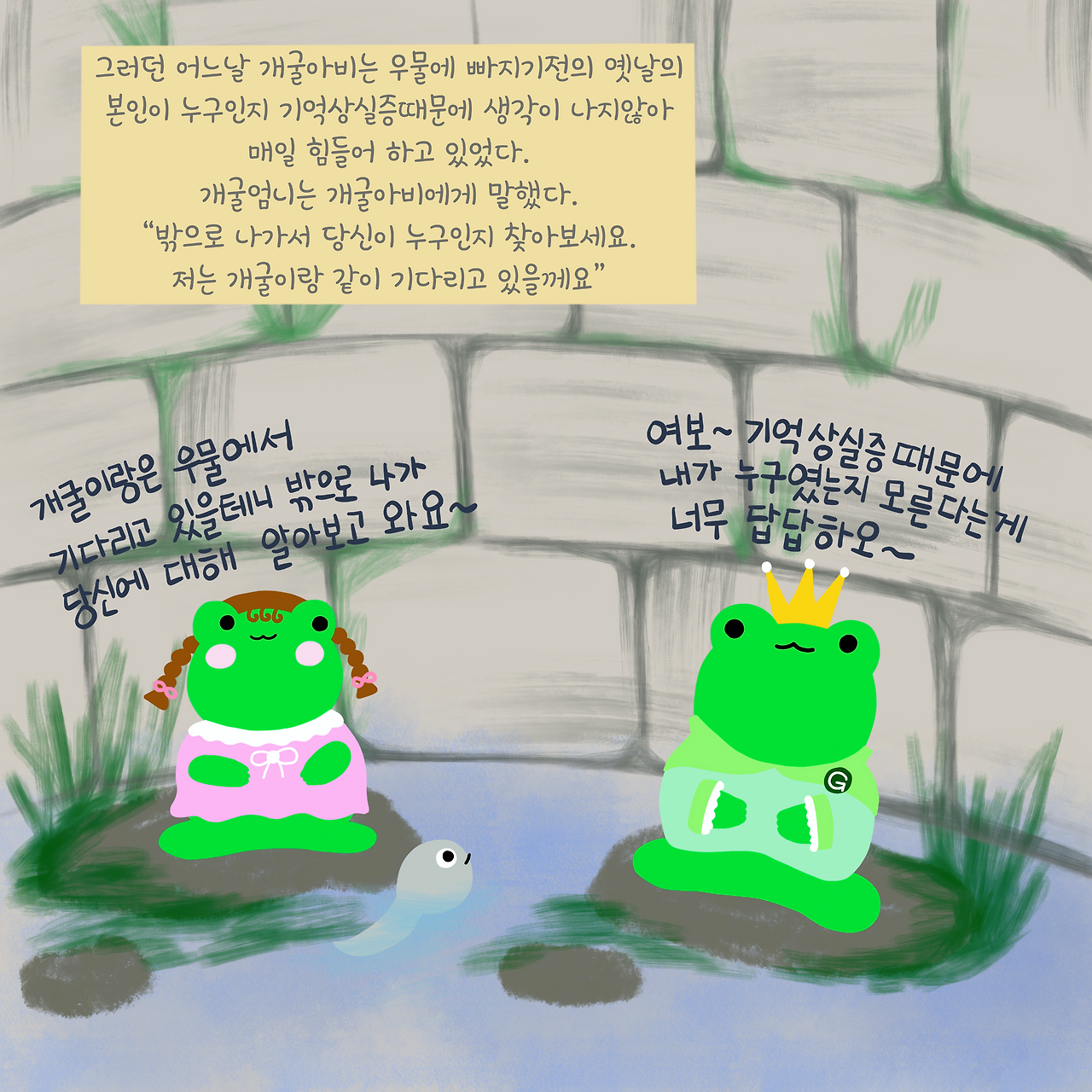 "그랴 그러니깐 개굴엄니는 우물에 살다가 갑자기 여기 연못은 어떻게 오게 된겨?"