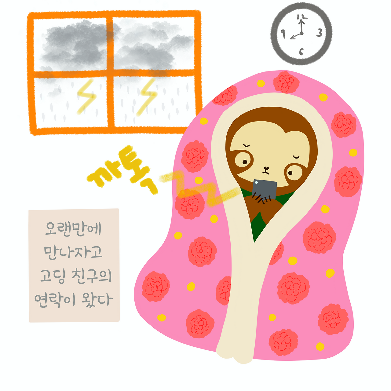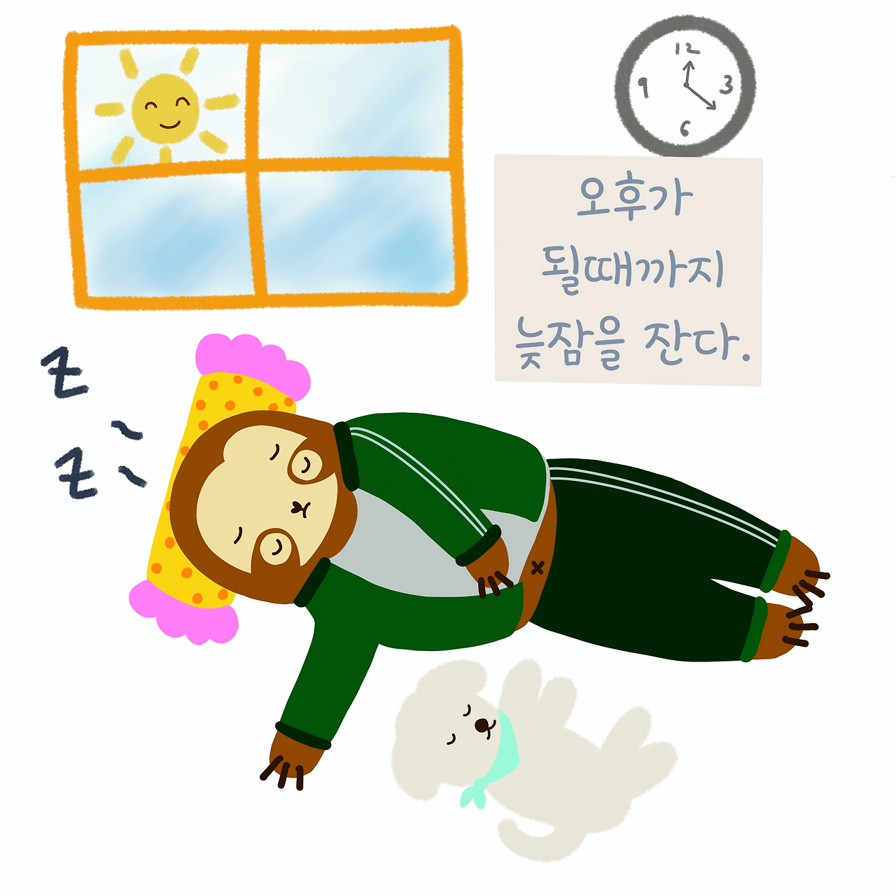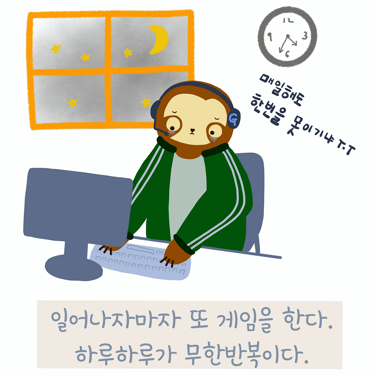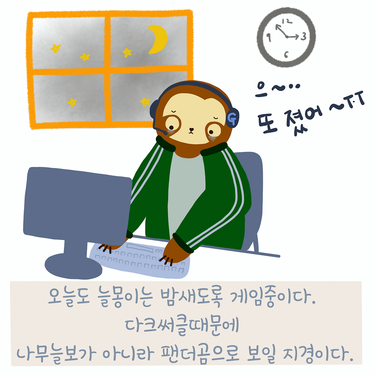 오늘도 하루종일 밤늦도록 게임만 하다가 늦잠을 자는 늘몽이.