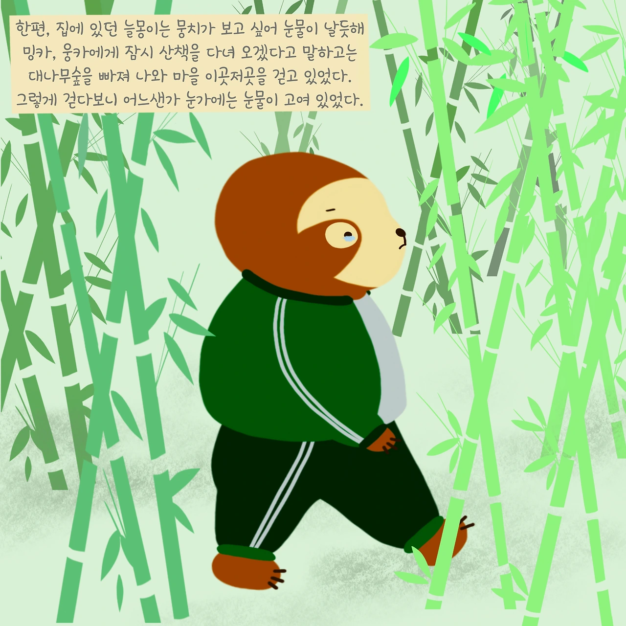 한편, 집에 있던 늘몽이는 뭉치가 그리워 눈물이 날듯해 밍카, 웅카에게 잠깐 산책을 다녀오겠다고 말하고는 대나무숲을 빠져 나와 한참을 걷고 있었다.
