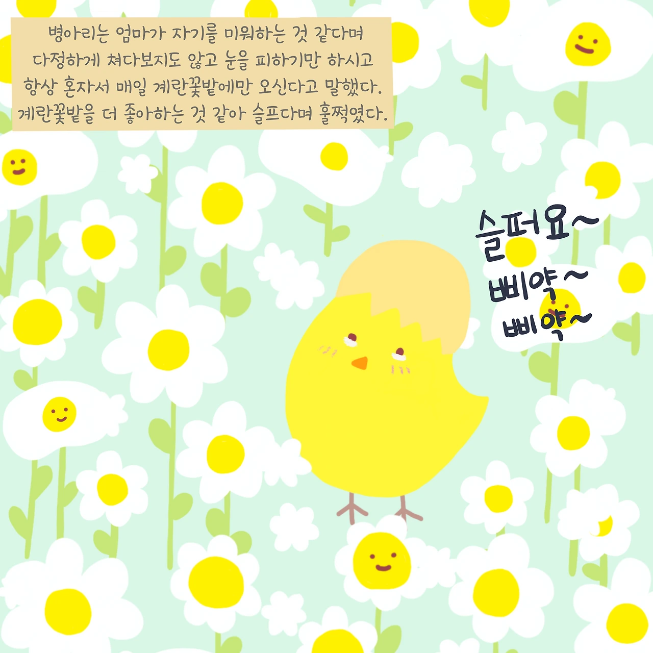 엄마는 저를 미워하시는게 틀림없어요~ 그래서 계란꽃밭을 보니 슬퍼서 울고 있었어요~”