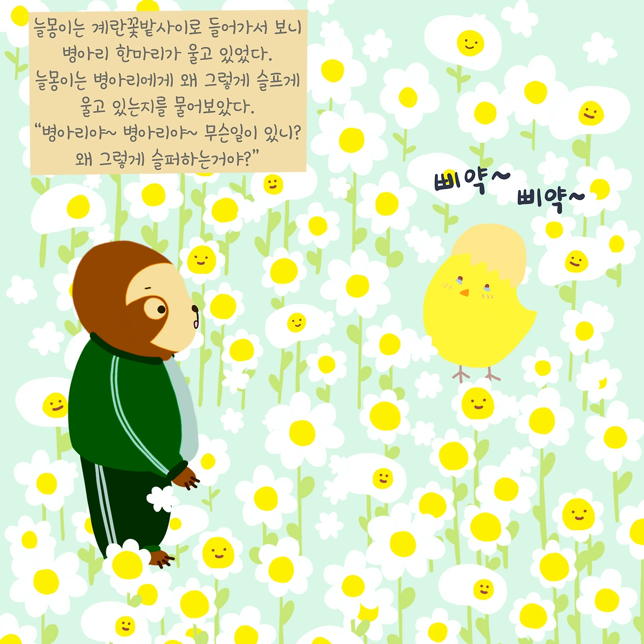향긋한 꽃내음이 나는 계란꽃밭에서 계속 훌쩍이는 울음소리에 그냥 무심히 지나칠수 없었던 늘몽이는 계란꽃밭속으로 들어가서 누가 울고 있는지 찾아보았다.