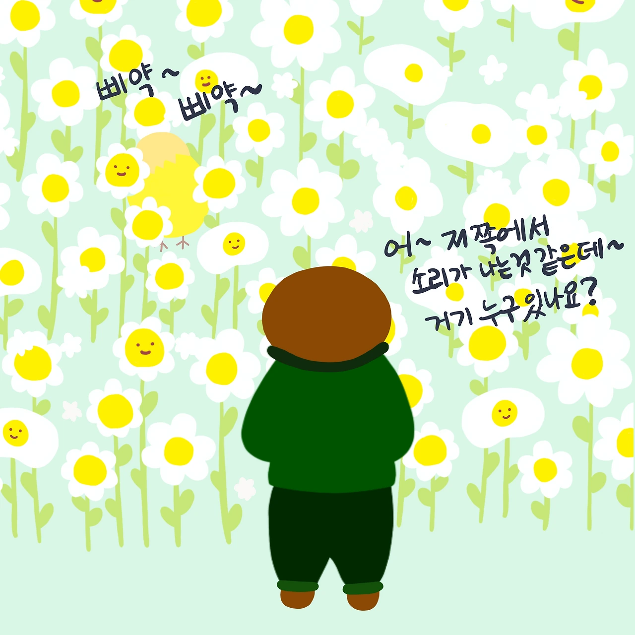 병아리의 이야기를 듣기 위해 늘몽이는 자세를 낮추어 꽃밭에 쪼그리고 앉았다.