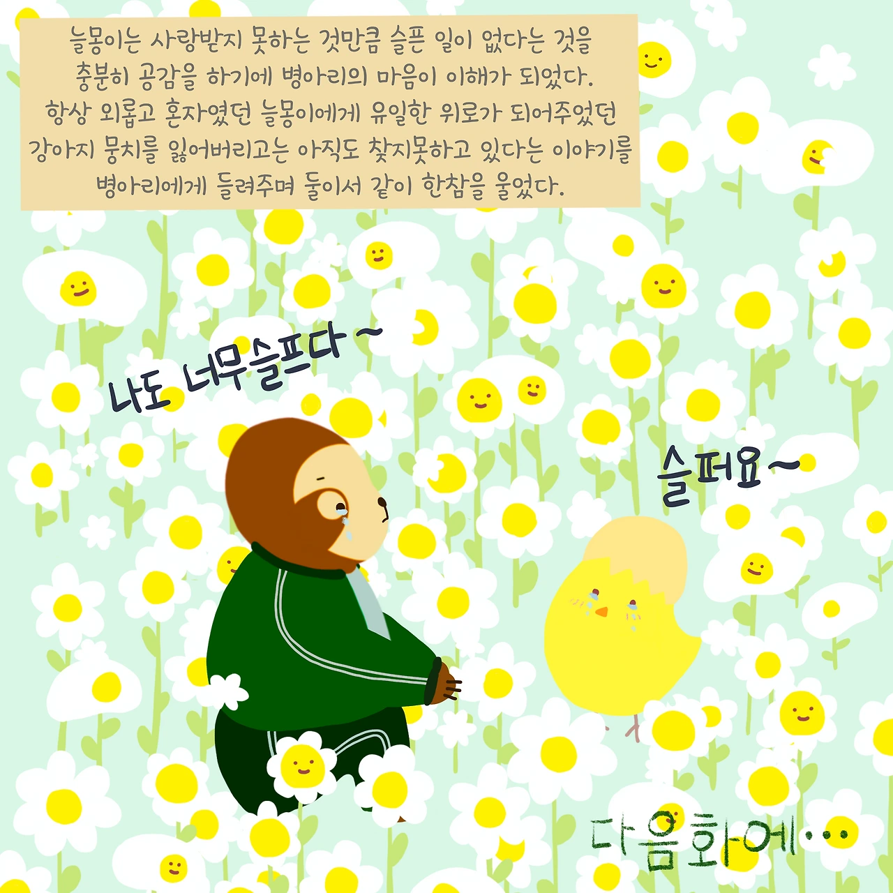 그렇게 서로의 이야기를 하면서 늘몽이와 병아리는 한참을 말없이 눈물을 흘리며 서로를 위로해주었다.
