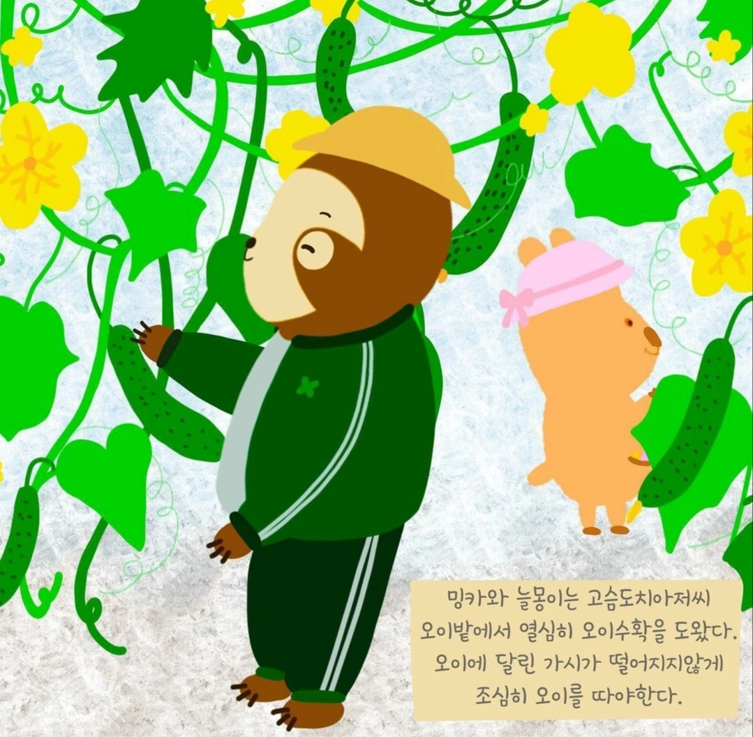 고슴도치아저씨의 당부말씀을 듣고는 조심조심 오이를 따기 시작했다.