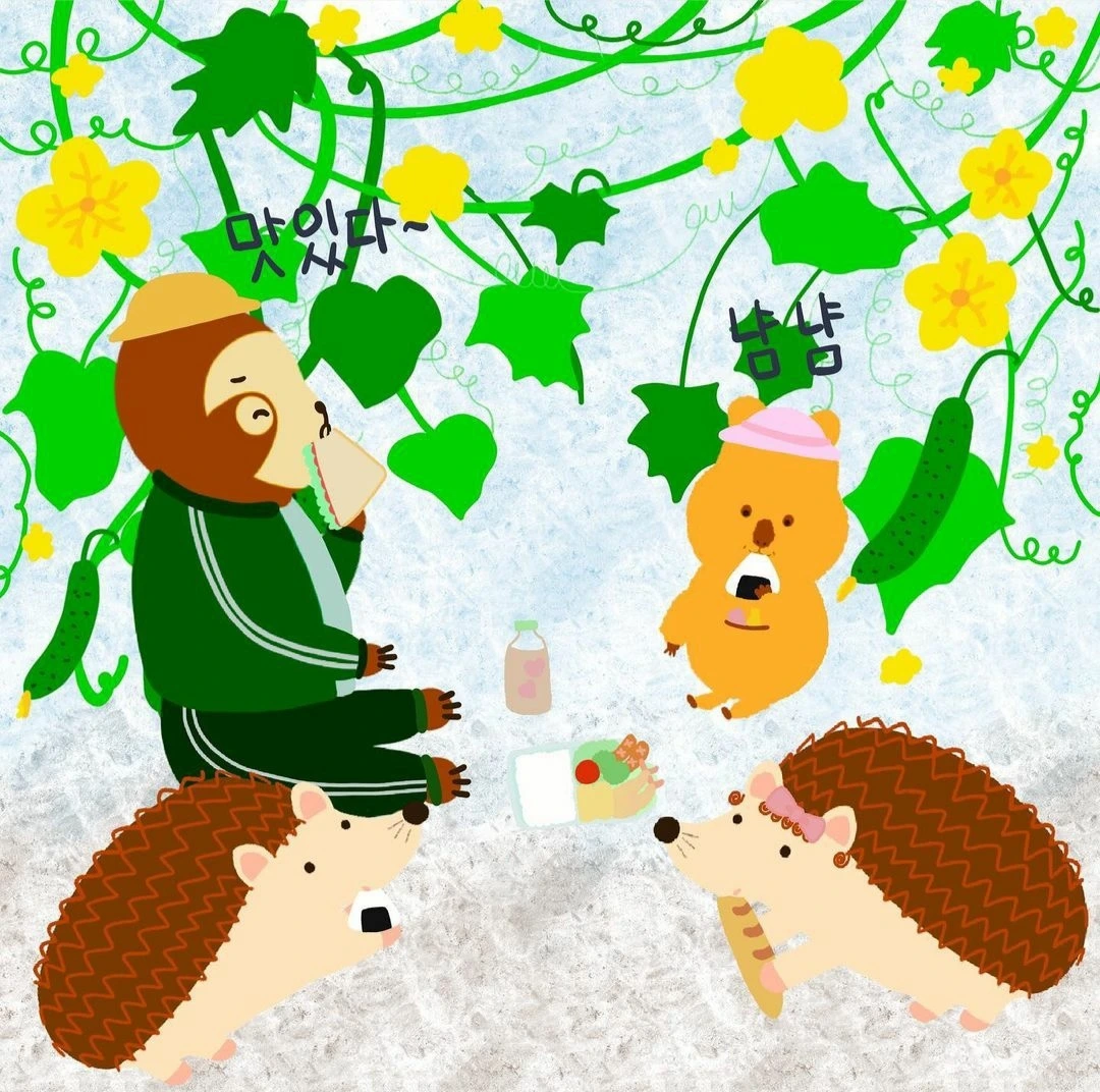 고슴도치부부와 밍카, 늘몽이는 새참을 맛있게 먹고 그날 가시오이수확을 다 끝내고 일을 도와줘서 고맙다고 고슴도치부부가 주신 가시오이를 들고 집으로 왔다.