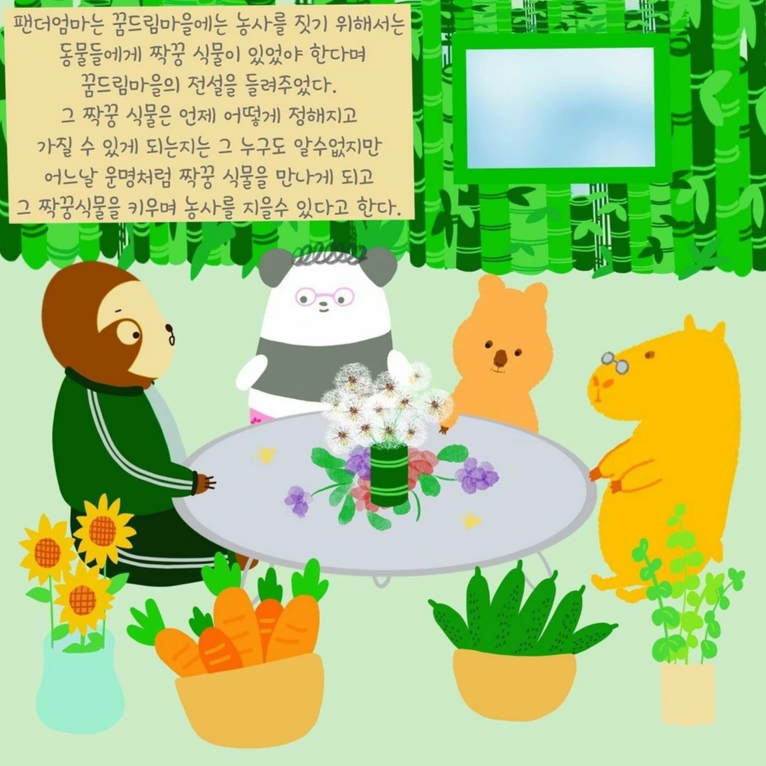 팬더엄마는 농사일을 배우고 싶다던 늘몽이에게 꿈드림마을의 전설을 이야기해주었다.