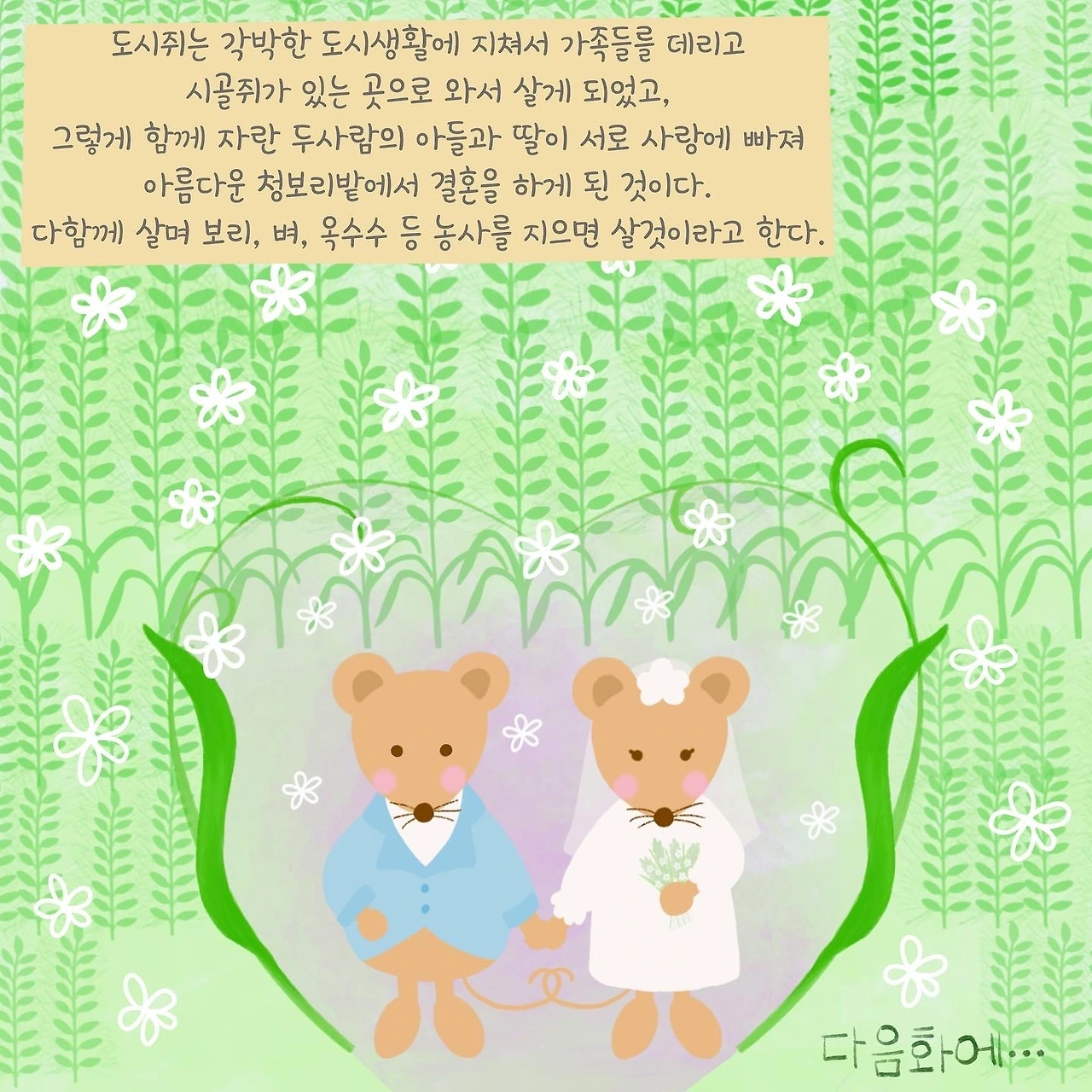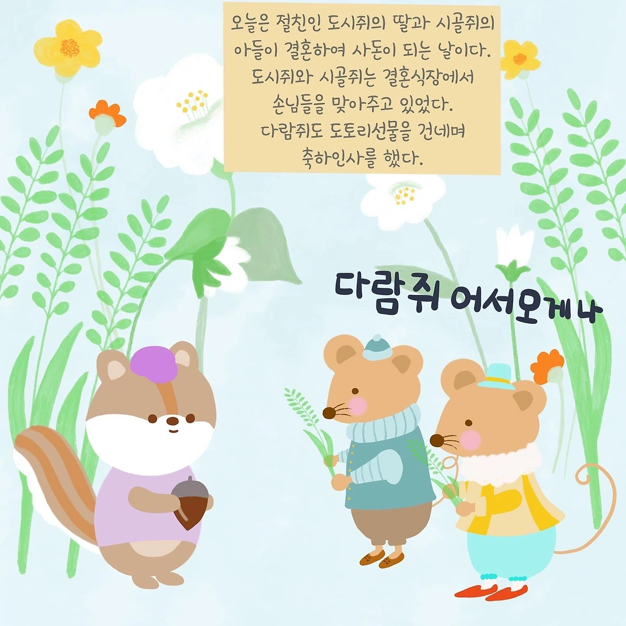 결혼식장 입구에는 멧밭쥐인 도시쥐와 시골쥐 두 절친이 사돈이 되는 날이라 서로 손님들를 맞으며 인사를 나누고 있었다.