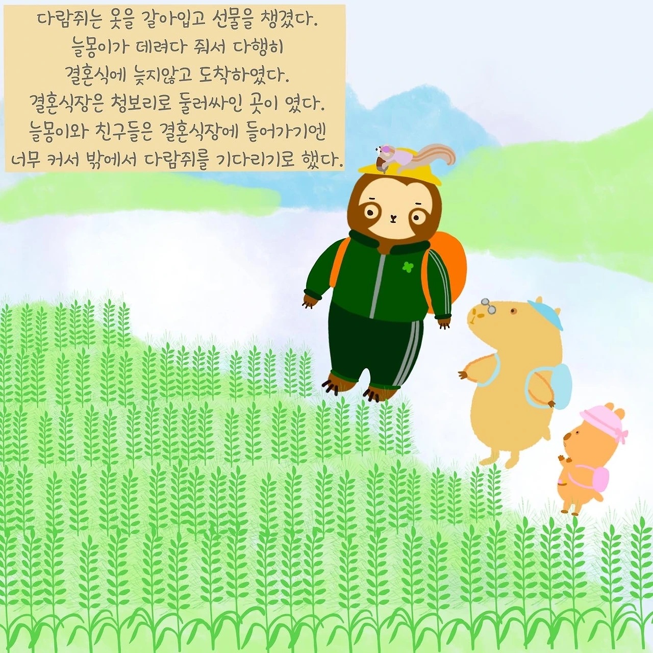 다람쥐는 얼른 옷을 입고 선물을 챙겨 늘몽이와 친구들과 결혼식장으로 향했다.